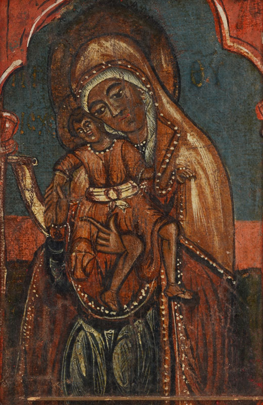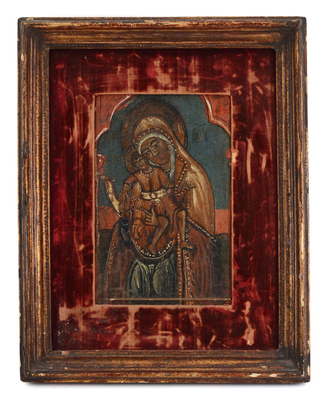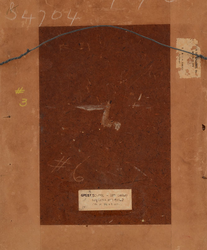 GREEK SCHOOL 18TH C MADONNA AND CHILD PAINTING: Oil/Canvas mounted on board, Plaza Art Galleries label affixed verso, carved and gilded gesso frame, 16 1/2'' x 13''. CONDITION: Several repairs to tears, laid down on board, needs cleaning, sold as is.