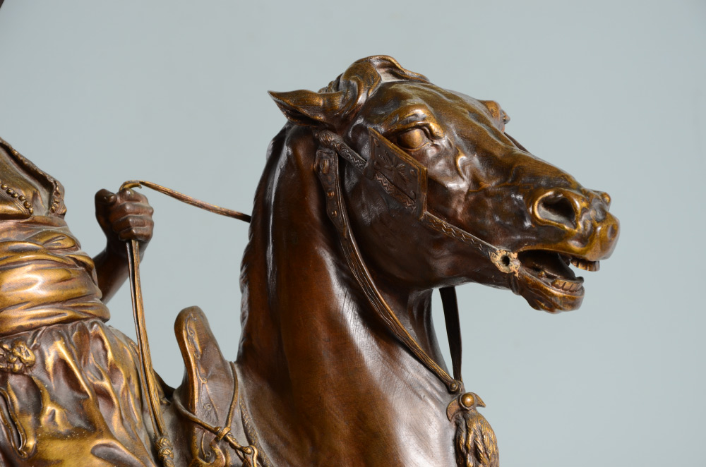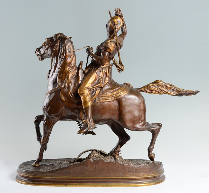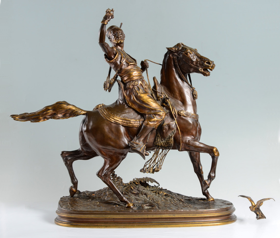MENE, Pierre Jules, (French, 1810-1879): Arab Falconer on Horseback, Bronze, incised signature, 28'' h. x 29'' x 12''.