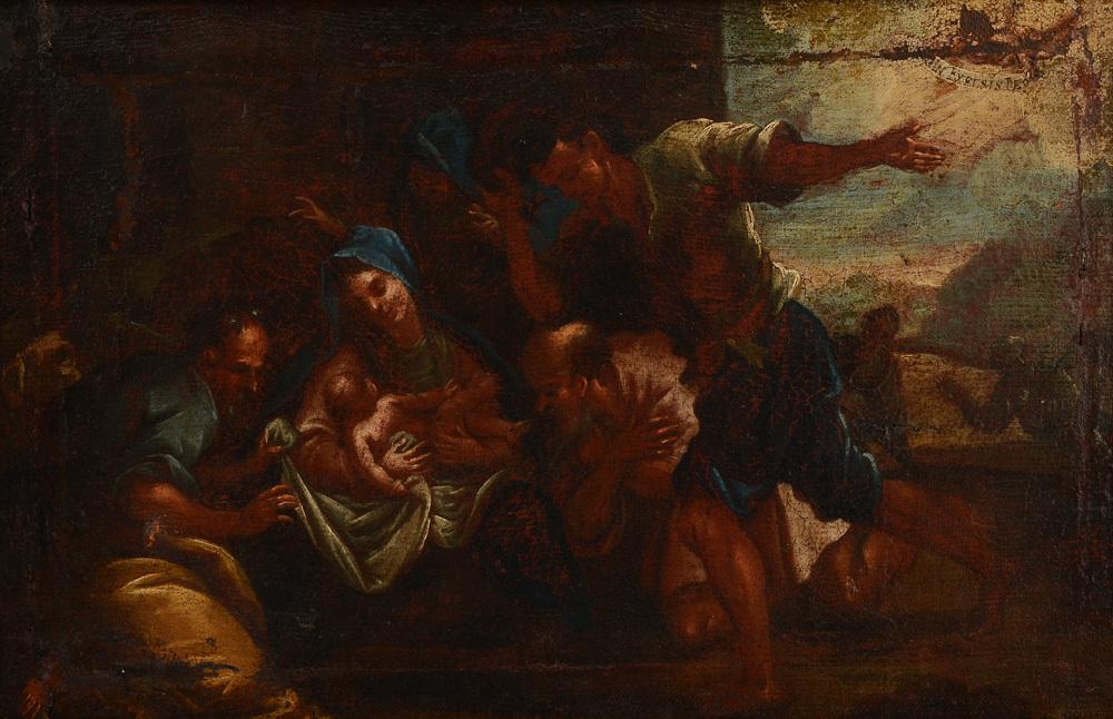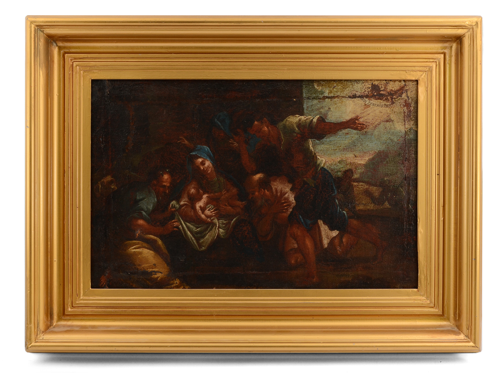 OLD MASTER STYLE GLORIA EXCELSIS DEO PAINTING: Depicts the Virgin Mary and the infant Christ, Oil/Canvas 13 3/4'' x 21 3/4'', framed 21'' x 29''.