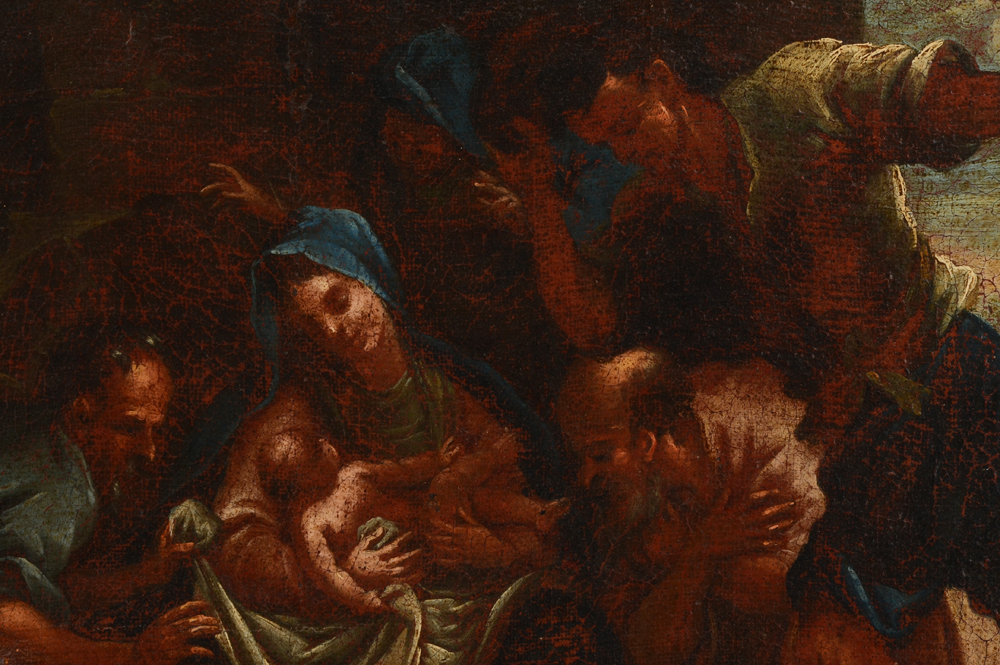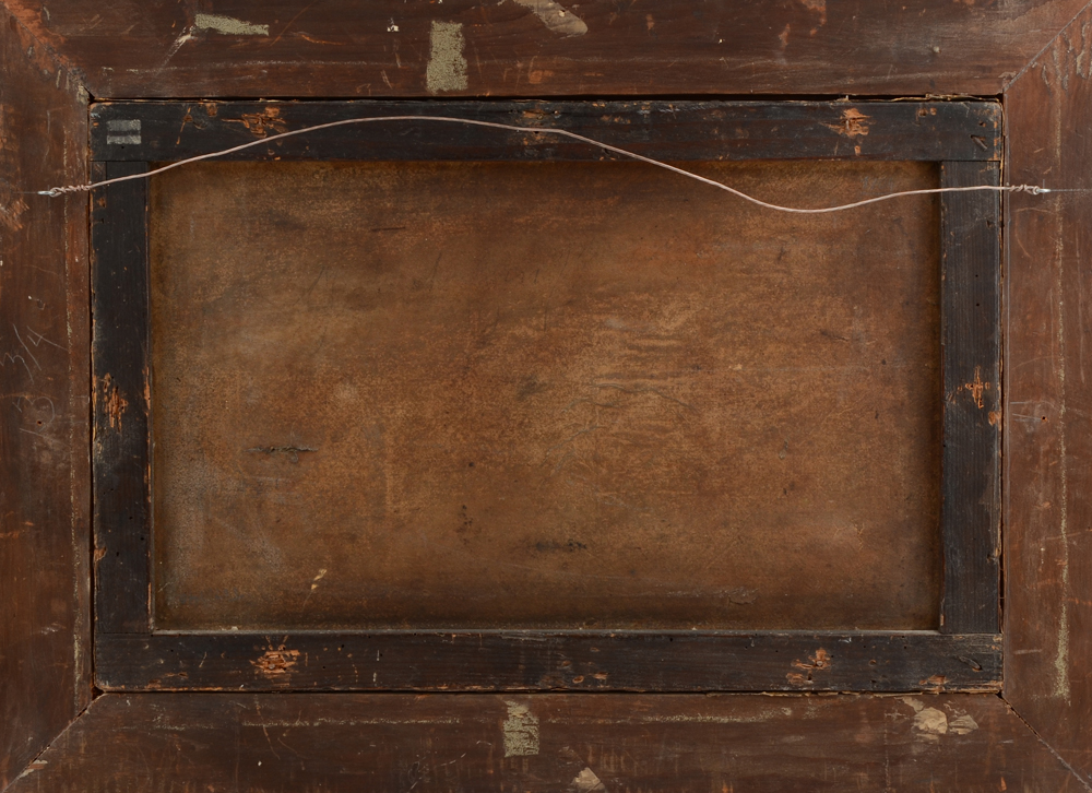 CONDITION: Several punctures, relined, stretcher bar wear, scattered paint loss, frame touched up.