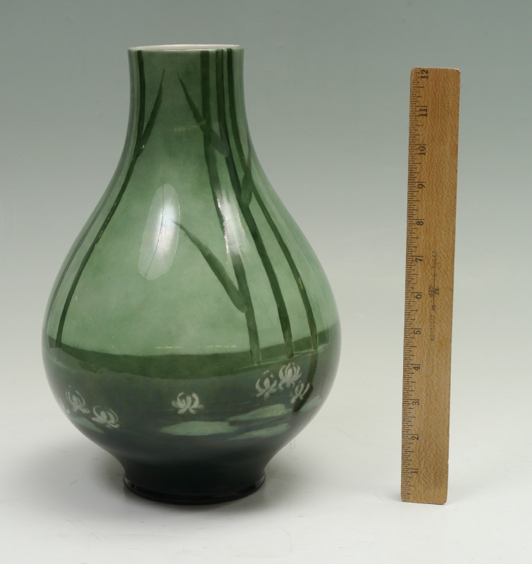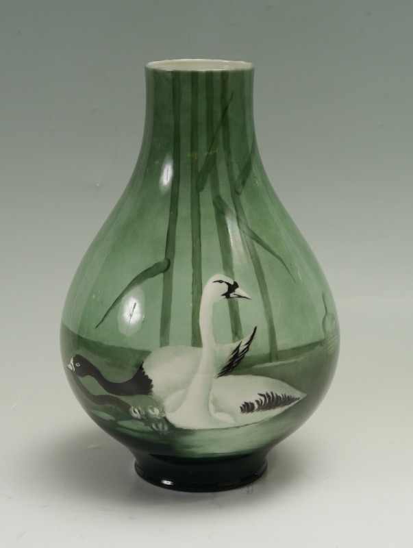 CERAMIC ART AMERICAN BELLEEK PORCELAIN VASE: Hand decorated in a serene scene depicting black neck swans. Ca. 1894-1906. Measures approx. 13'' tall.