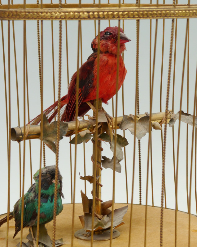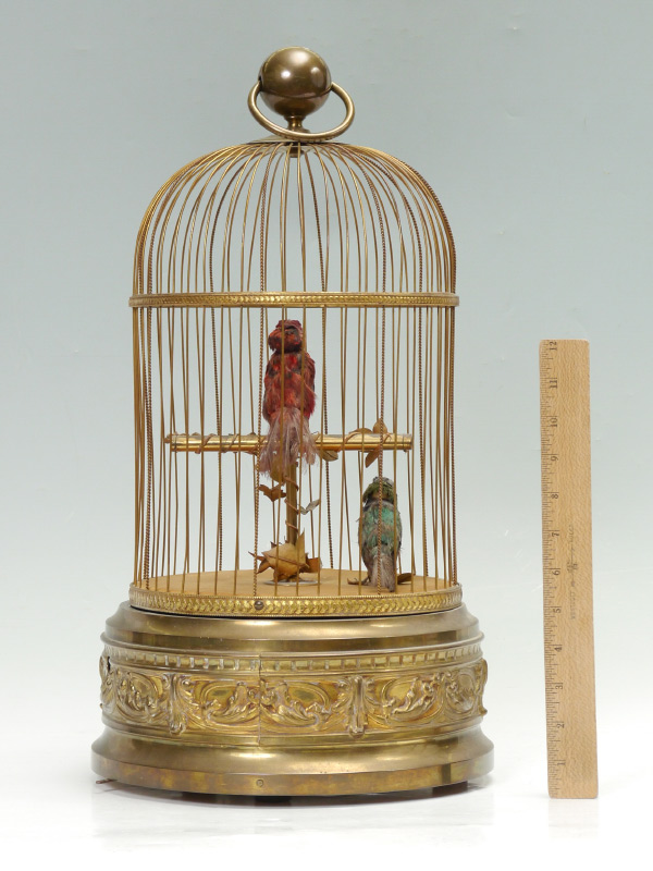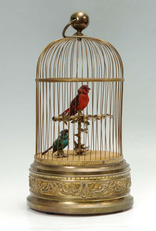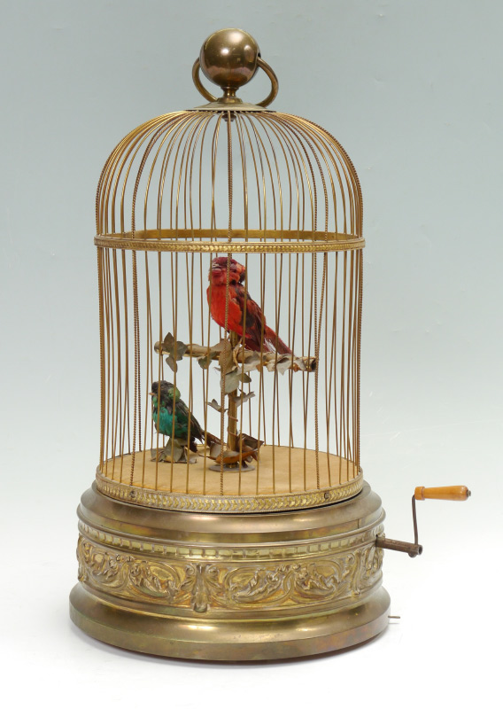 LARGE FRENCH DOUBLE BIRD AUTOMATON IN CAGE: 2 whistling and articulated automaton birds in brass cage. Cage with embossed brass base, wire cage. Marked on wood bottom Made in France. 3 settings, currently functioning. Overall measures 20 1/4'' h. x 10 1/2''.