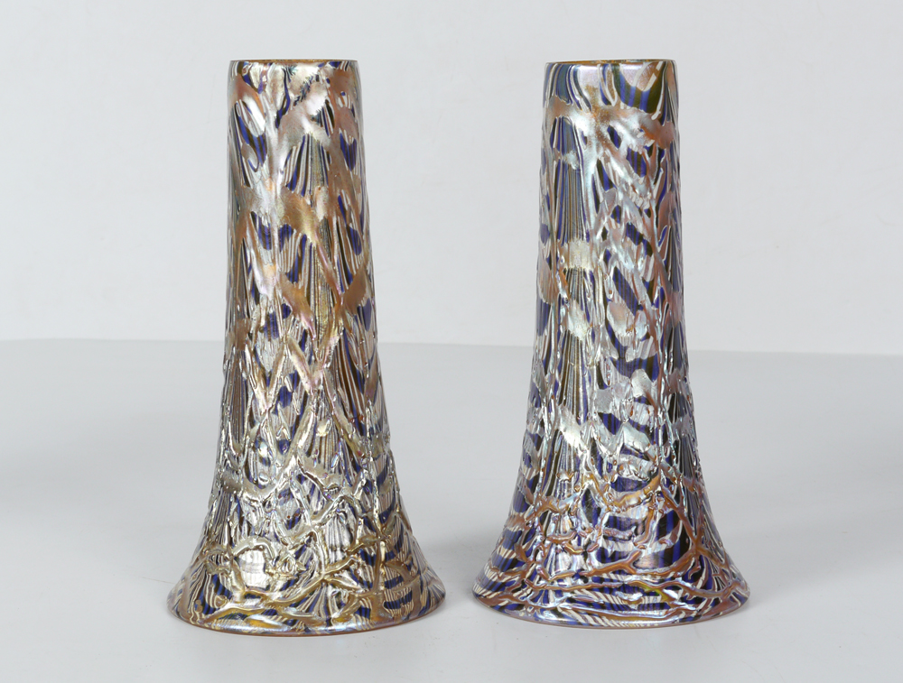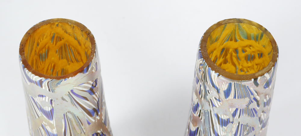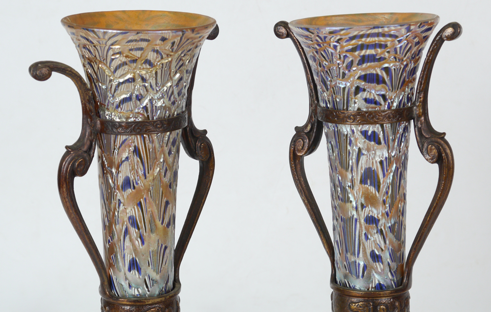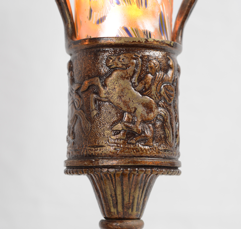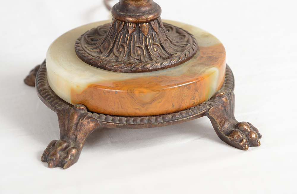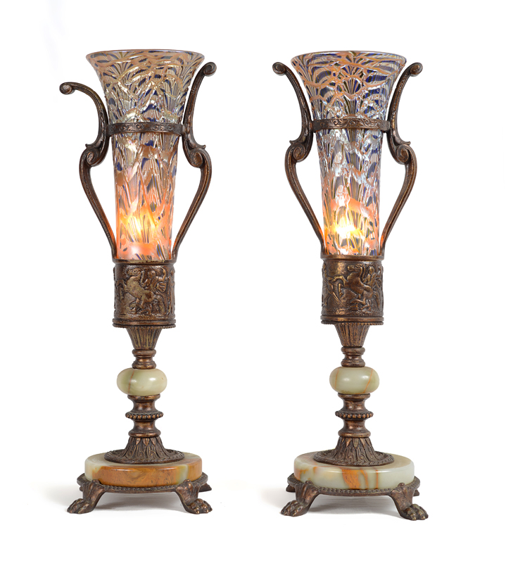 PAIR DURAND MOORISH CRACKLE ART GLASS SHADE LAMPS: Patinated metal bases with onyx inserts, neo-classical hunt scene at collar. Unmarked Durand Moorish Crackle shades with flared rim. Overall lamps measures 17 1/4'' h. x 6'' including 8 1/4'' x 4 1/4'' shades.