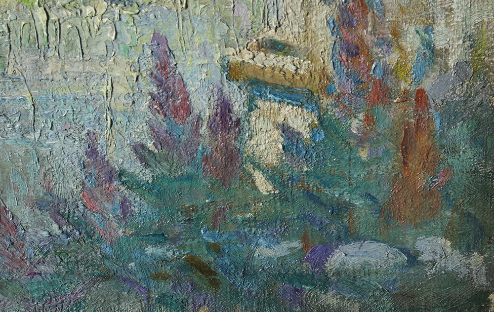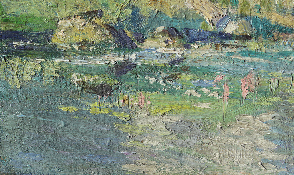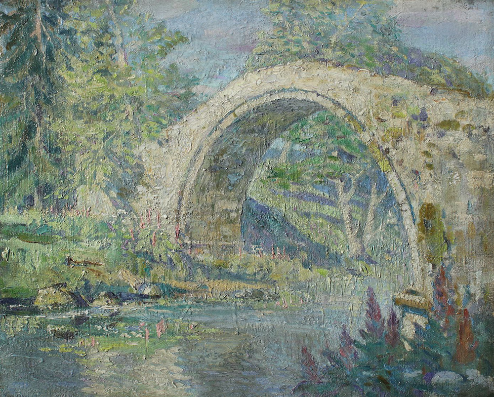 FINE IMPRESSIONIST PAINTING OF A STONE BRIDGE: Oil/Canvas, 16'' x 20'', no visible signature, circa 1920, pierce carved and gilded frame, 23'' x 27''.