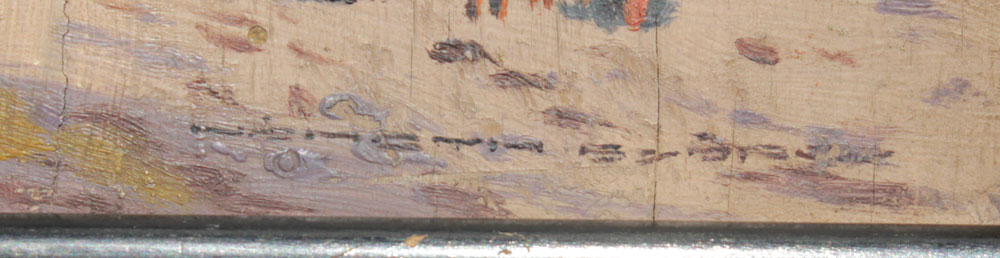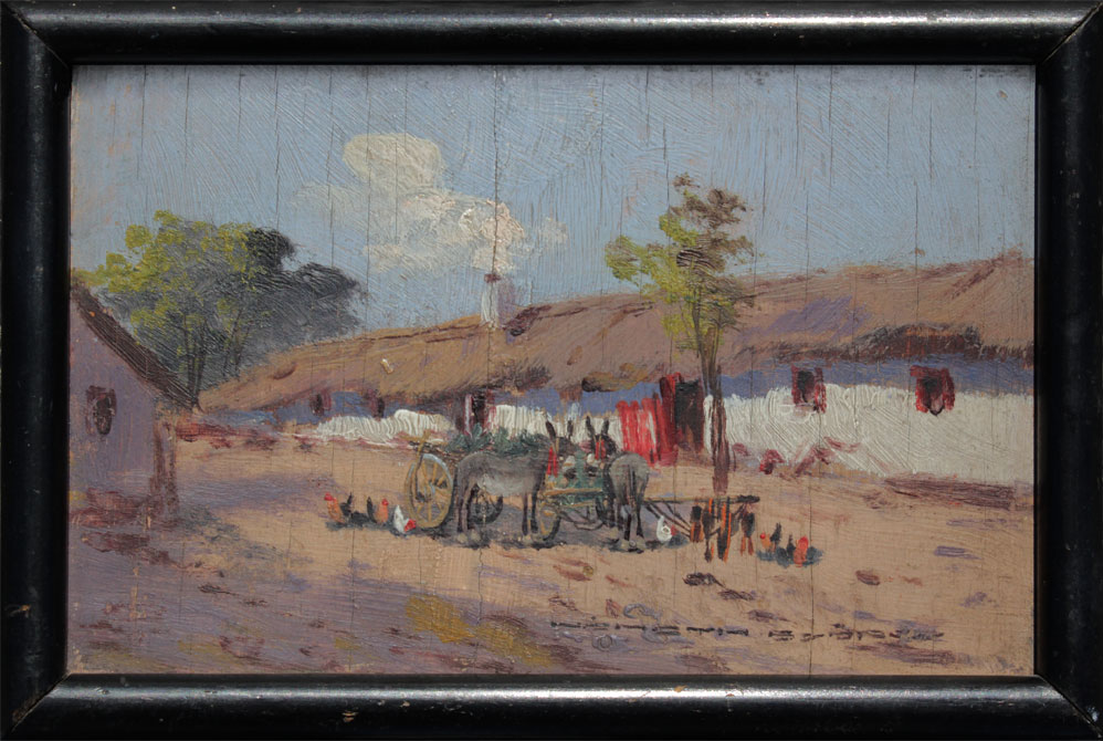 NEMETH, Gutahazi Gyorgy, (Hungarian, 1890 - 1962): Village Street Scene with Donkeys and Chickens, Oil/Board, 4 3/8'' x 6 3/4''. Primarily known as Nemethy Gutahazi Gyorgy, signed lower right Nemeth Gyorgy, framed, 5'' x 7 1/4''.