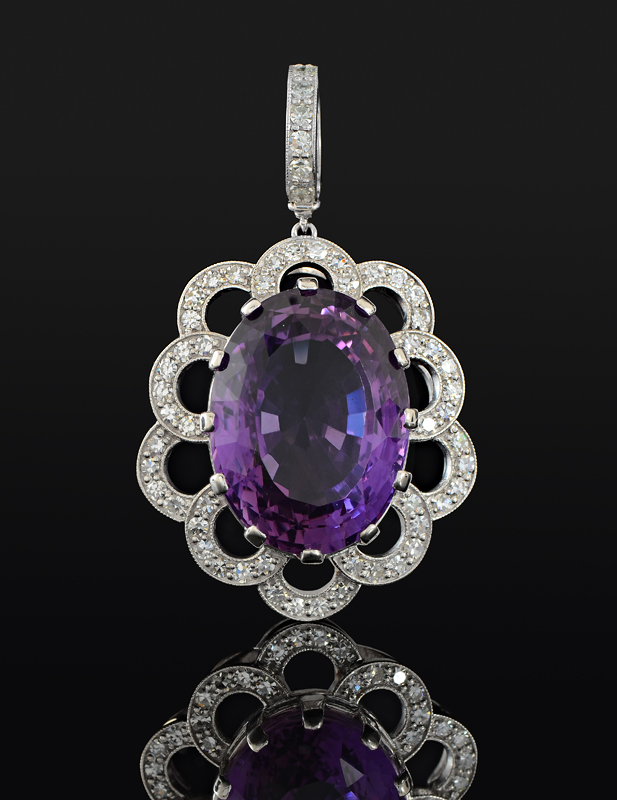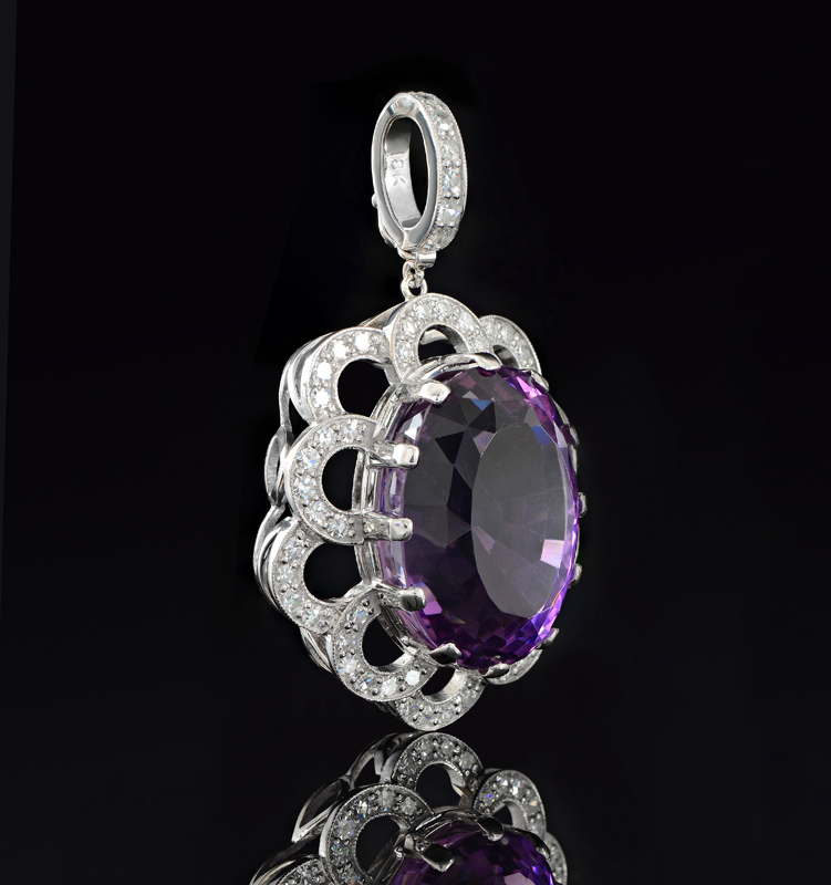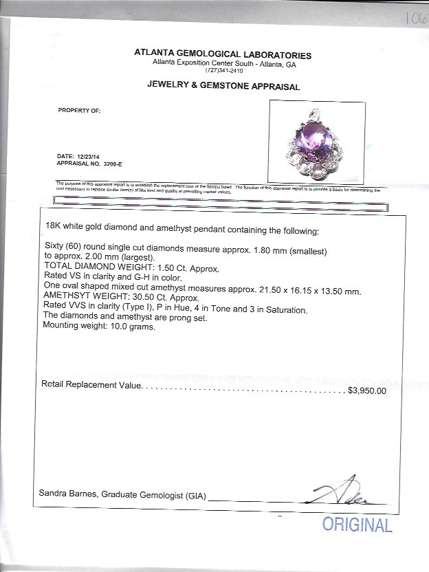 30.5 CT AMETHYST PENDANT WITH DIAMONDS: 18K white gold enhancer pendant centering a 30.5 Ct oval mixed cut amethyst of VVS clarity. Beautifully framed by 60 round single cut diamonds totaling approx. 1.5 Ct., averaging VS in clarity and G-H color. The bale is hinged, all stones are prong set. Length including bale: 1 7/8''. Mounting weight: 10 grams. Sold with current Atlanta Gemological GIA graduate's appraisal for $3,950.