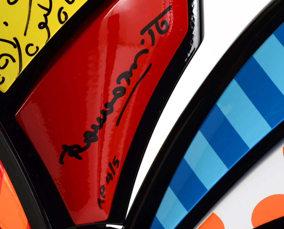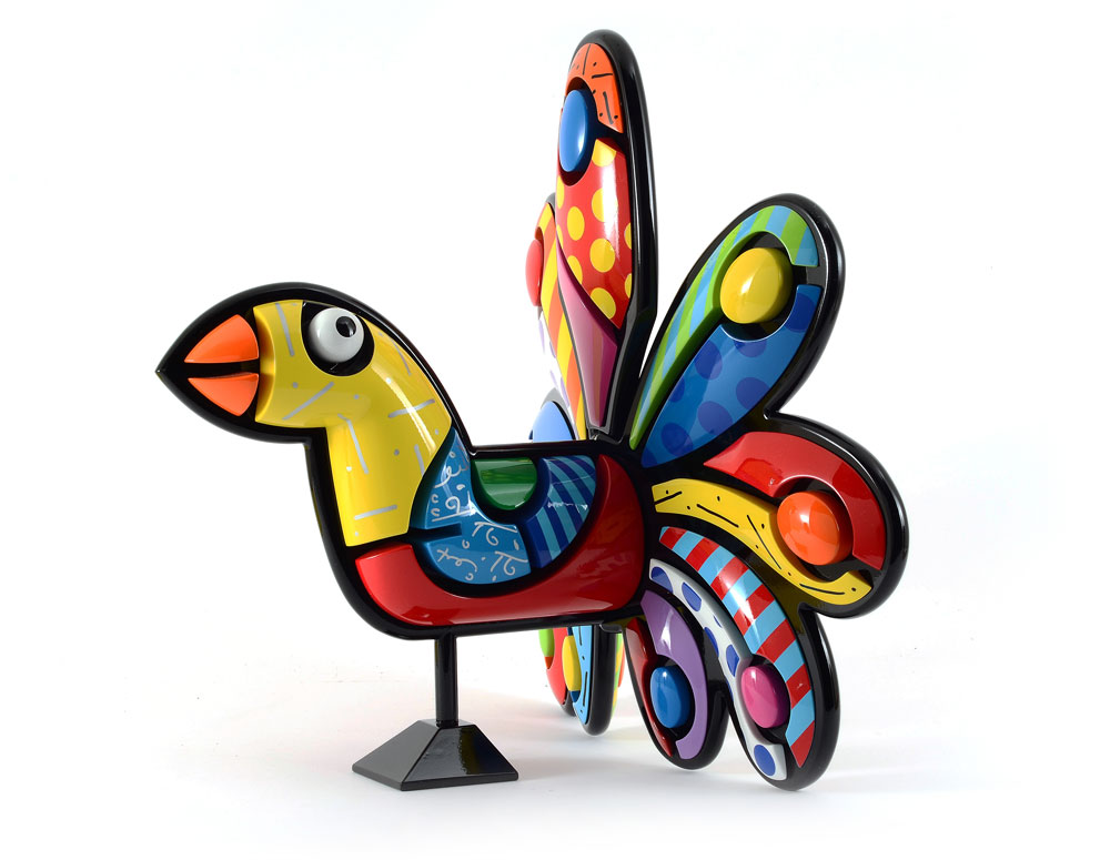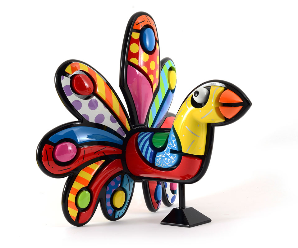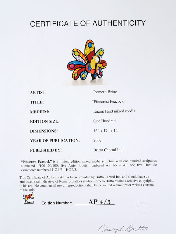 BRITTO, Romero, (Brazilian, 1963- ): Pinecrest Peacock, Enamel and Mixed Media Sculpture, signed and numbered artist proof 4/5, 16'' x 17'' x 12'', won as Grand Prize in Florida's Second Chance Lottery. Sold with signed and stamped Certificate of Authenticity.