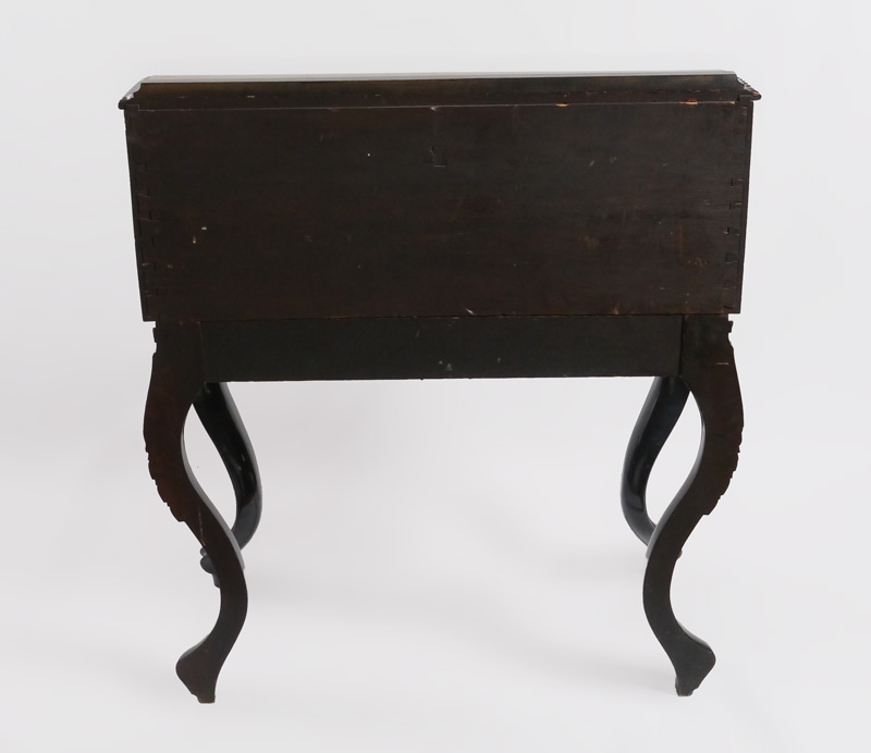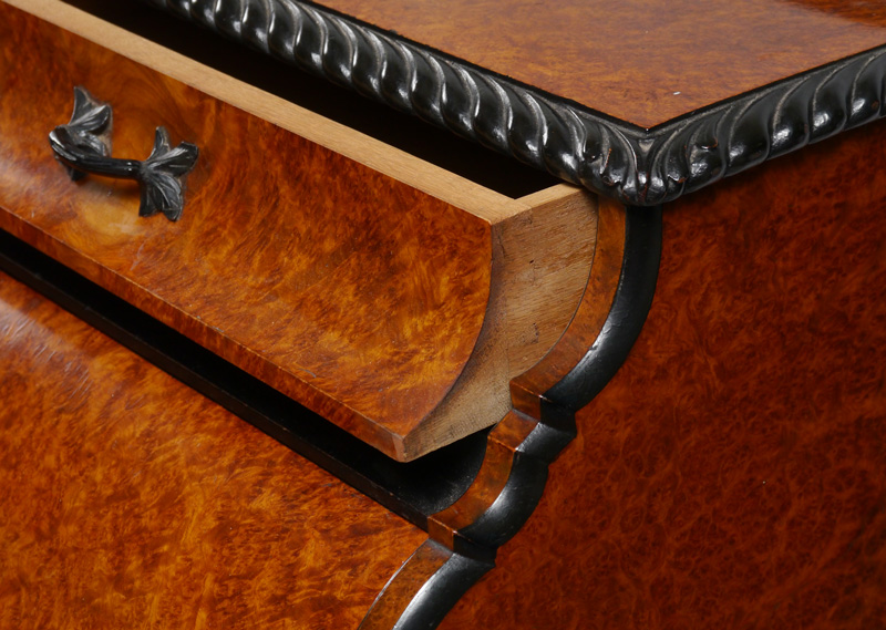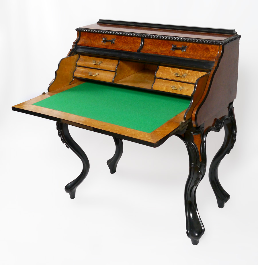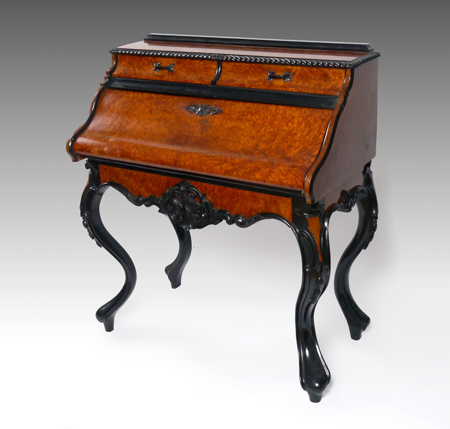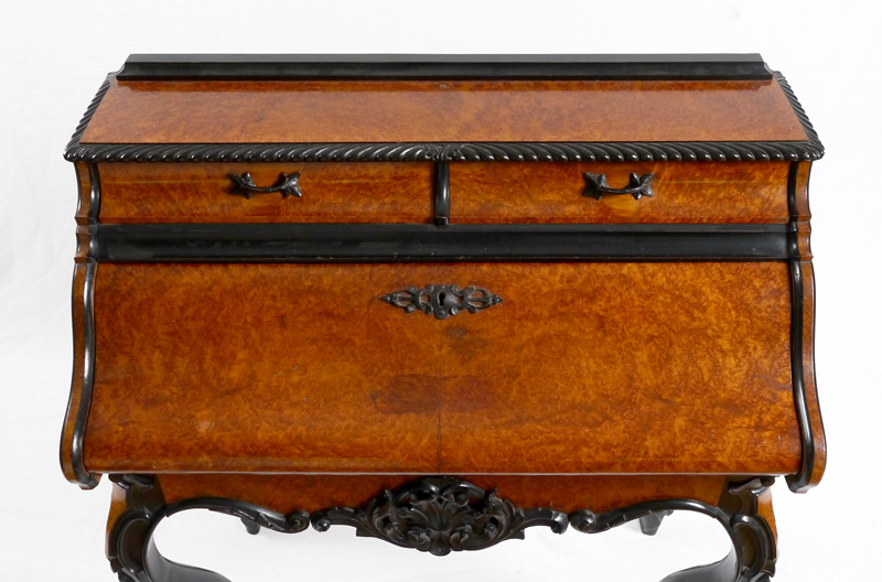 BIEDERMEIER STYLE FALL FRONT DESK: Burl veneer with carved trim, 2 half drawers over slide out fall front writing surface, 4 interior drawers and cubby hole. Lower full length drawer with carved decoration, carved and shaped legs. Overall measures 43'' h. x 38'' x 19 1/4''.