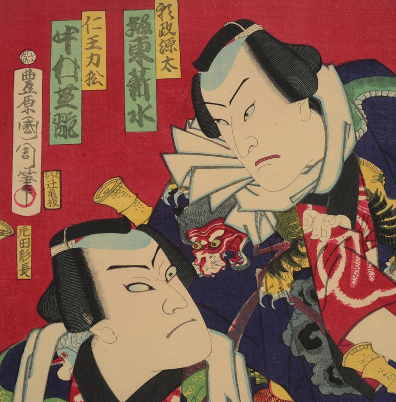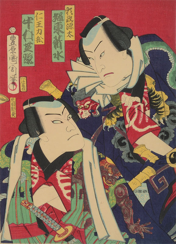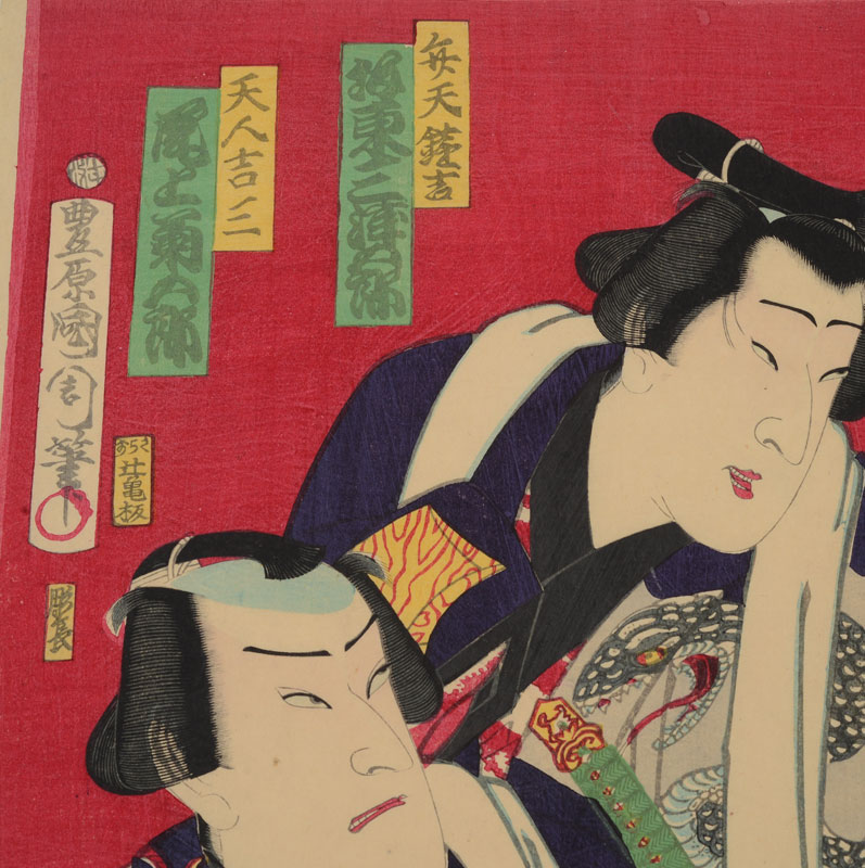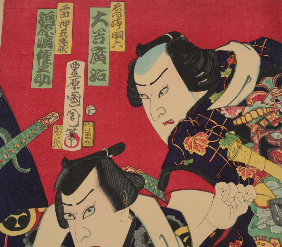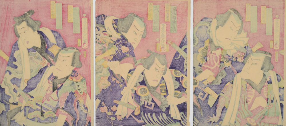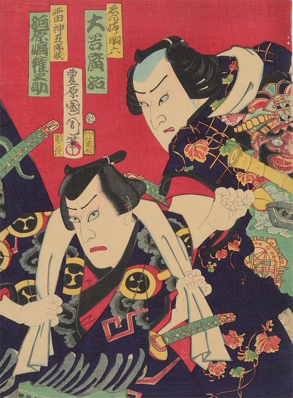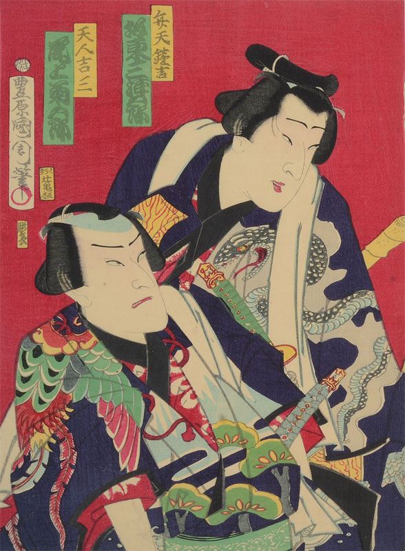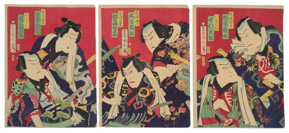 KUNICHIKA JAPANESE WOODBLOCK TRIPTYCH KABUKI ACTORS: A fine rich period print, red background, 14 1/2'' x 9 3/4'', unframed.