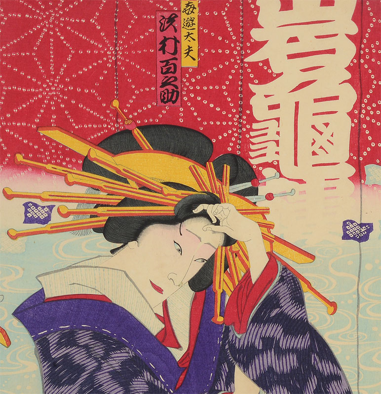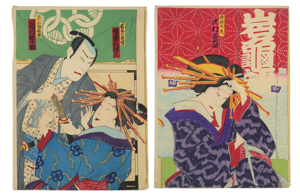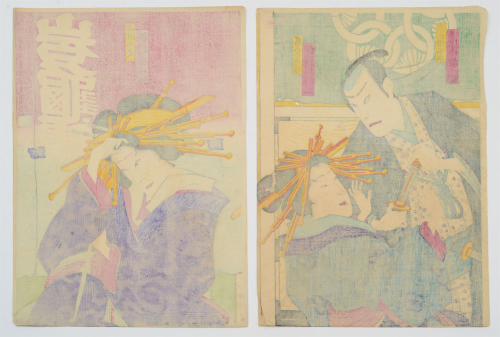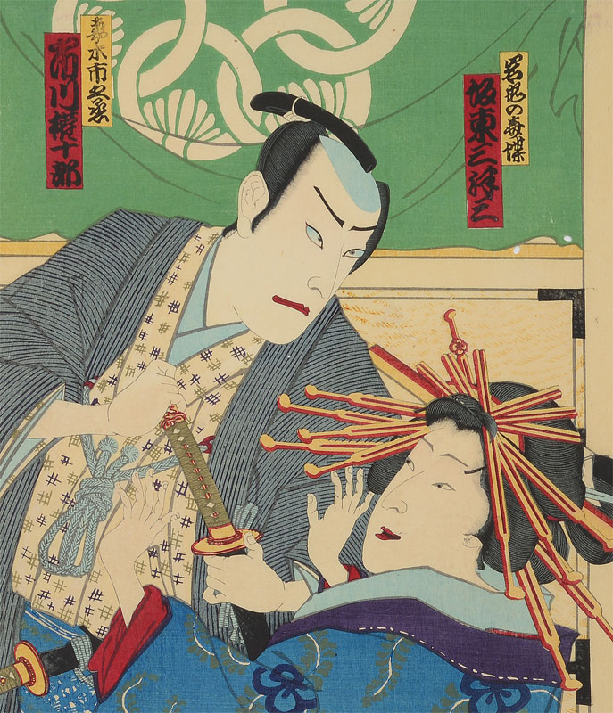 KUNICHIKA JAPANESE WOODBLOCK PRINT DIPTYCH: Kabuki actors, fine richly inked period print, 14 1/2'' x 9 3/4'', unframed.