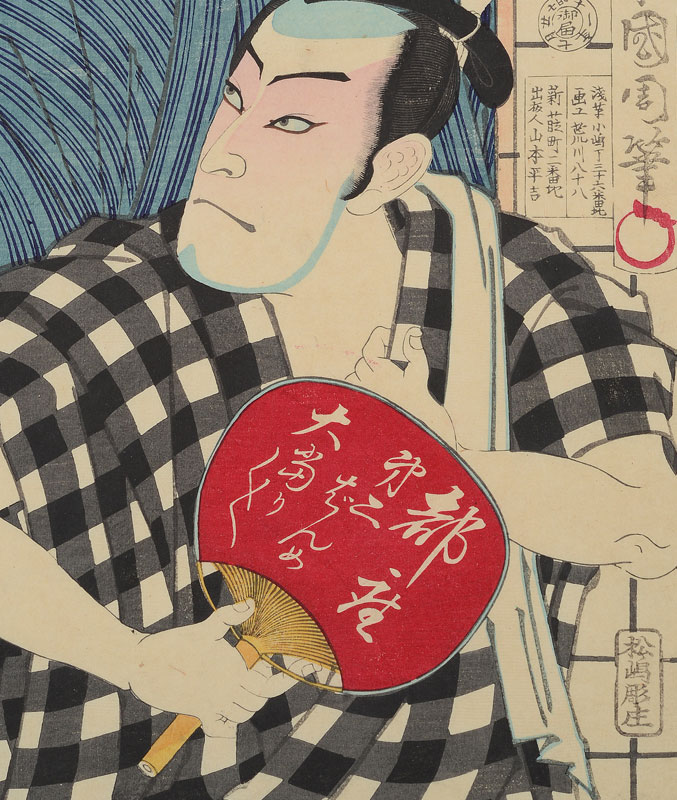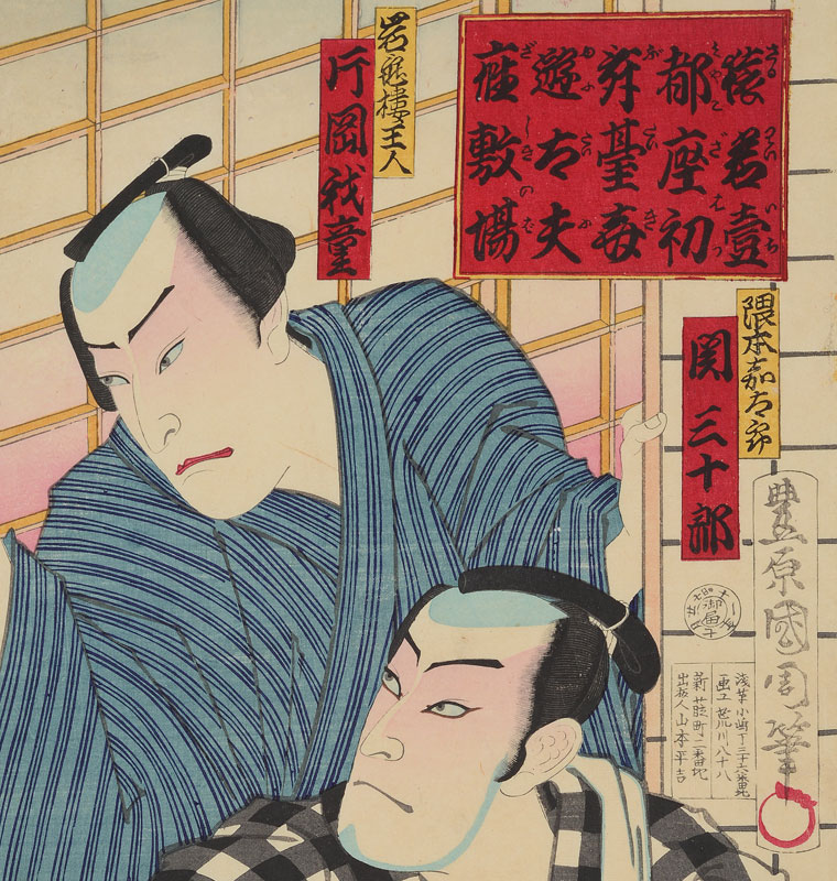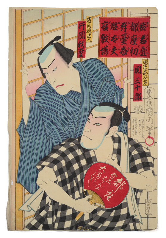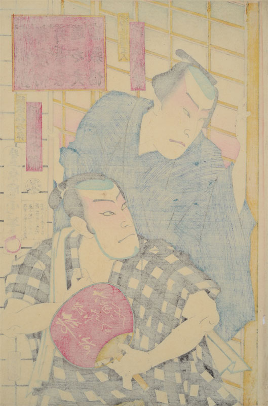 KUNICHIKA JAPANESE WOODBLOCK PRINT OF KABUKI ACTORS: 14 1/2'' x 9 3/4'', unframed.