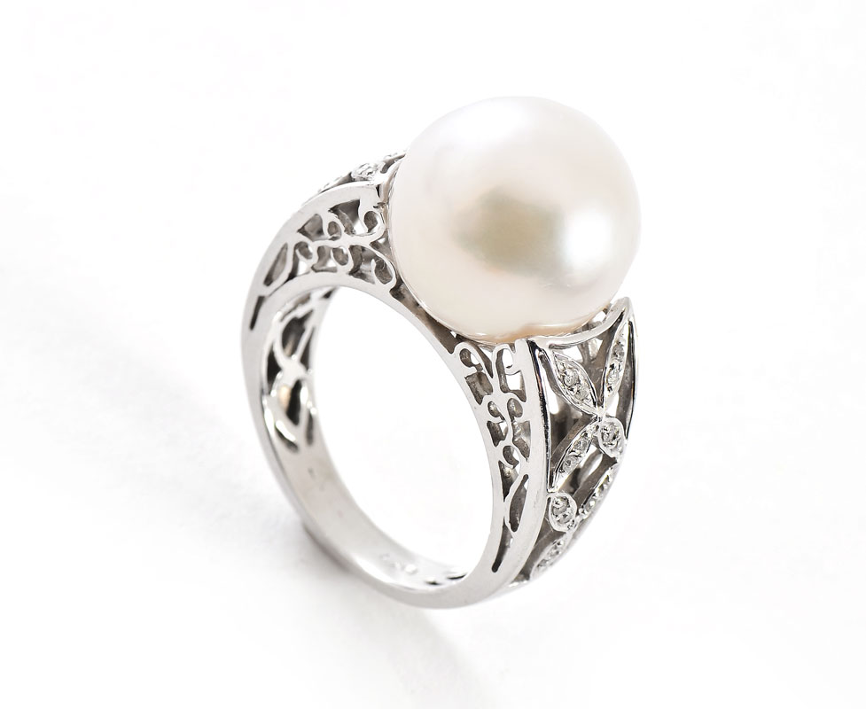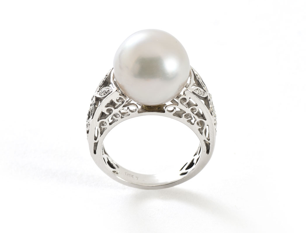 18K PEARL & DIAMOND RING: Filigree 18K white gold ring centers one 13.00 mm cultured pearl, white in color with a medium/high luster. 28 round full cut diamonds total approx. .25 Ct. Rated VS in clarity and G-H in color. The diamonds are bead set. The pearl is peg and epoxy set. Weight: 8.8 grams. Size 7.