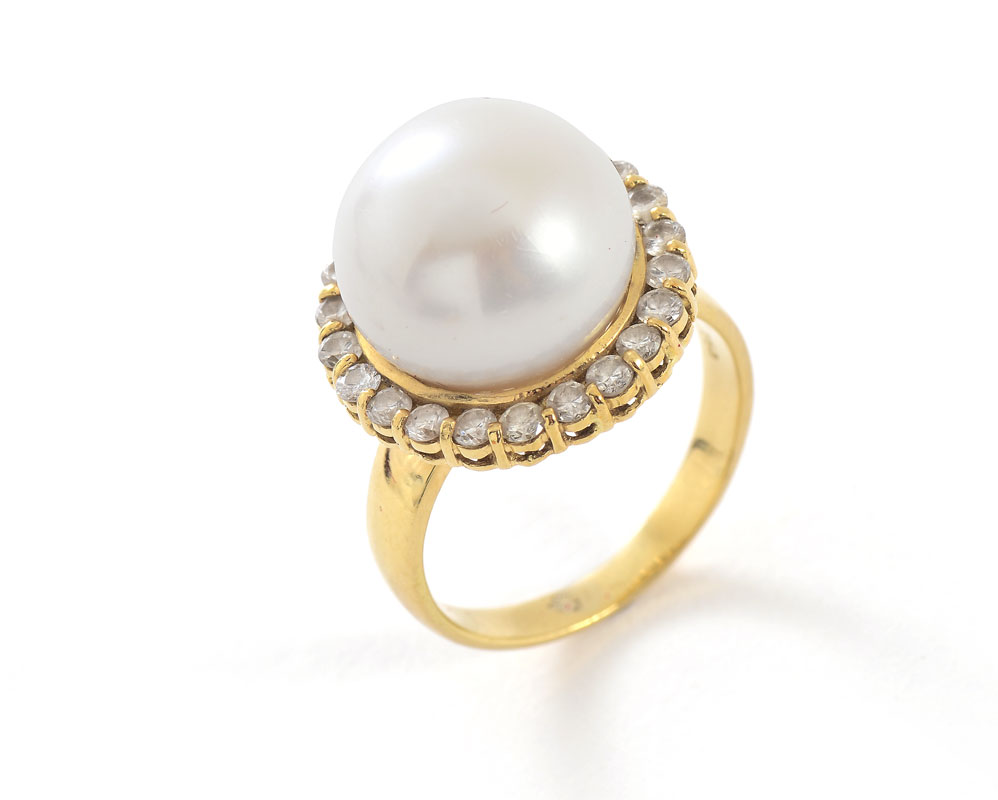 18K PEARL & DIAMOND RING: 18K yellow gold ring centers one 13.00 mm cultured pearl, light cream in color with Medium/Low luster. Framed by 22 round full cut diamonds totaling approx. .85 Ct., rated VS in clarity and H-I in color. The diamonds are prong set. The pearl is peg and epoxy set. Weight: 9.0 grams. Size 7.