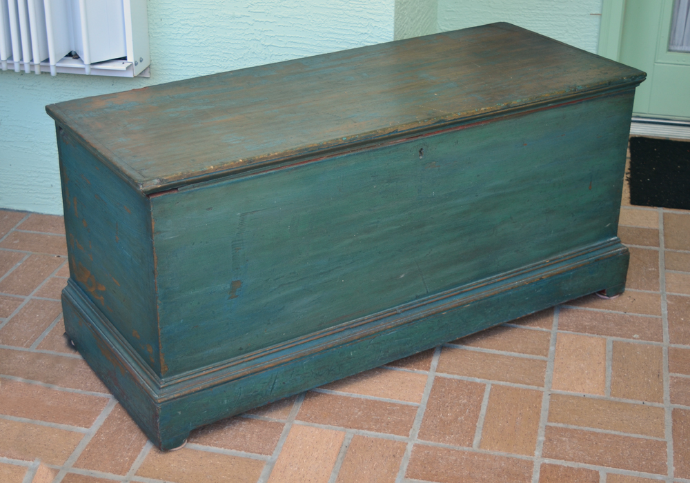 EARLY BLUE PAINTED 6 BOARD BLANKET CHEST: Pine 6 board chest with hinged top, overall measures 19 1/2'' h. x 41 3/4'' x 17 1/4''.