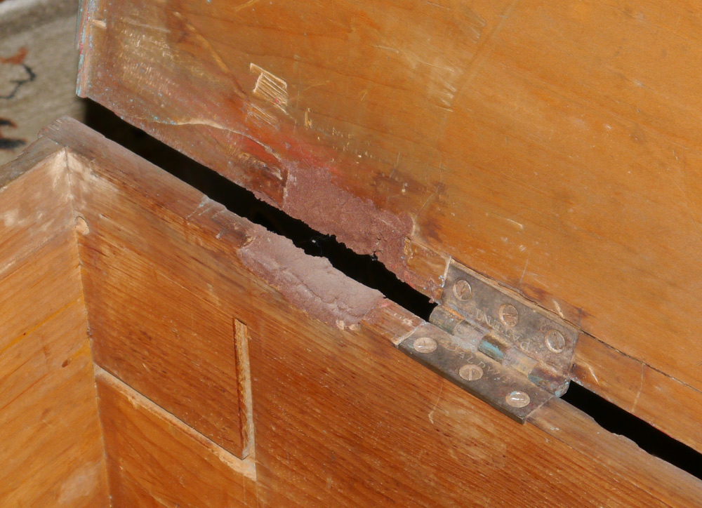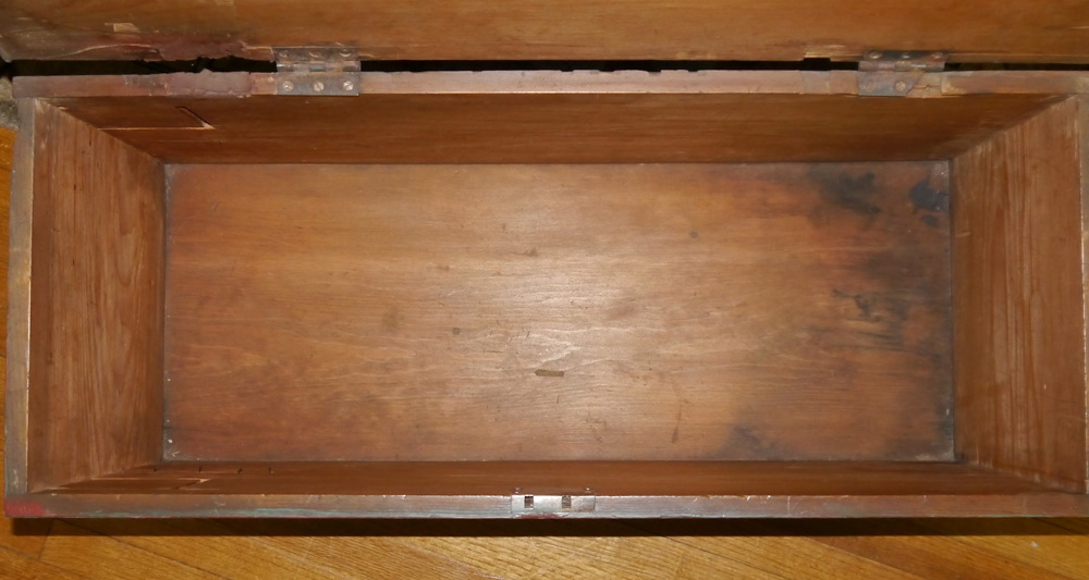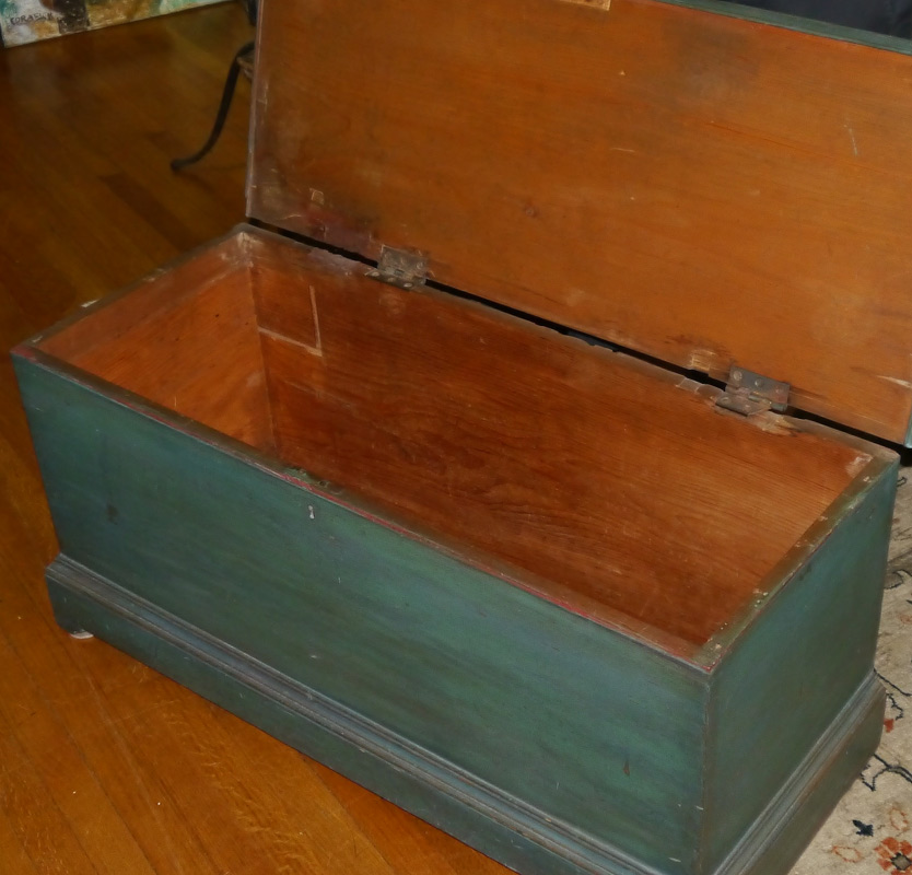 CONDITION: Missing interior box, replaced hinges, section of trim missing, repainted at some point.