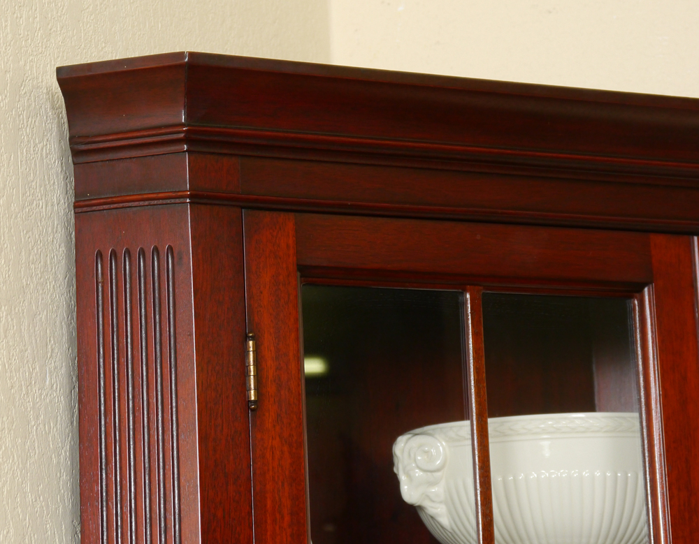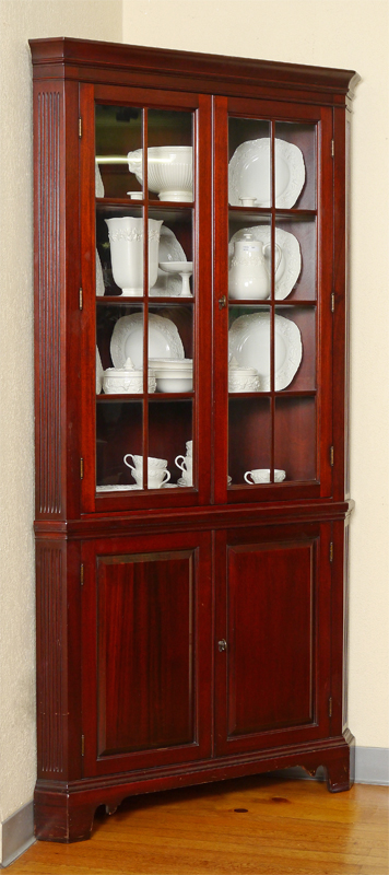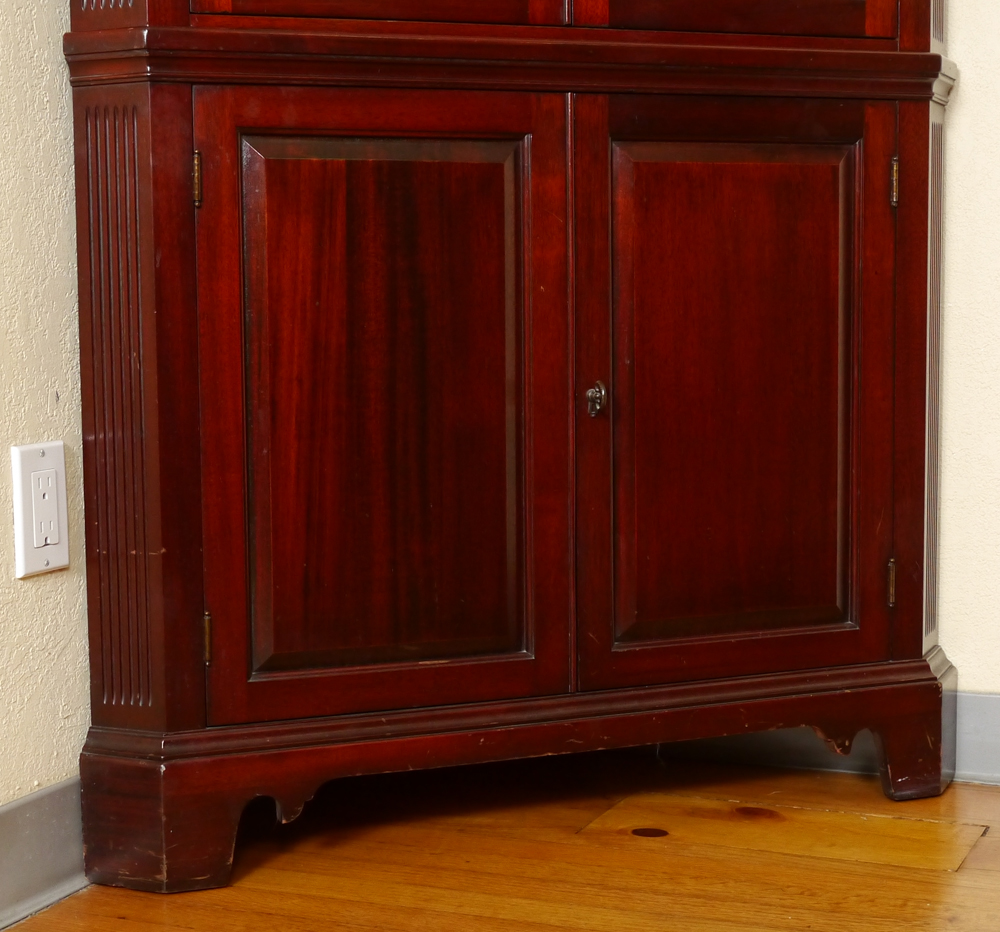 MAHOGANY CORNER CUPBOARD: 20th Century production, 16 light top 2 doors with 3 wood shelves over 2 blind doors, fluted stiles, shaped skirt. Overall measures 74'' h. x 37 1/4'' x 15 1/2''.