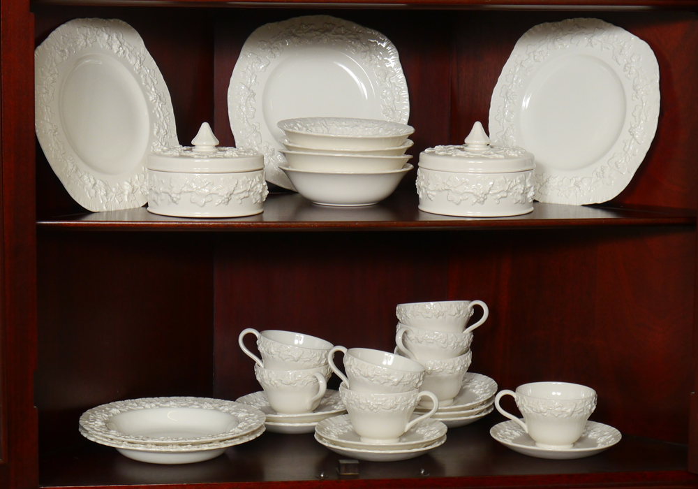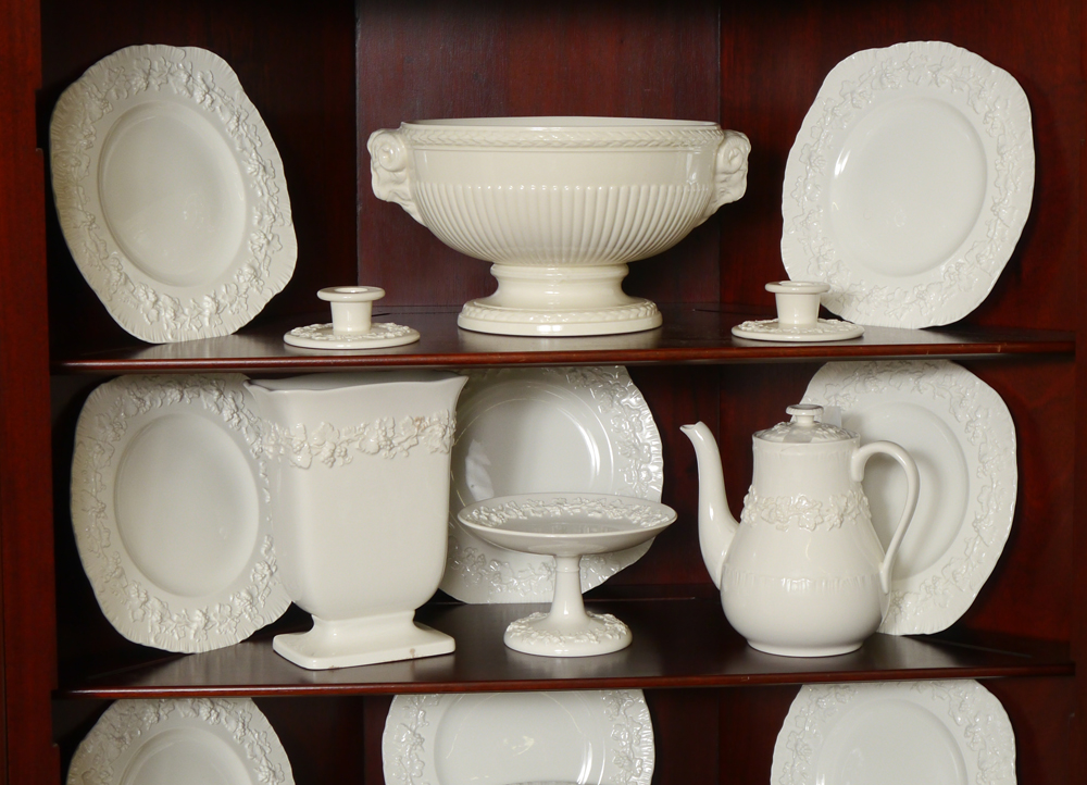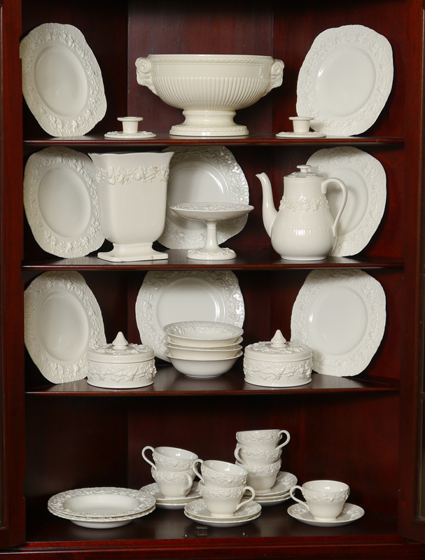 WEDGWOOD EMBOSSED QUEENSWARE CHINA: Approx. 29 pieces in the Embossed Queensware pattern by Wedgwood to include 7 luncheon plates (8 1/2''), 2 soup bowls (8 1/4''), 4 dessert bowls (6 1/4''), 8 tea cups, 4 saucers, coffee pot (7'' h/ x 7 1/2''), compote (3 1/4'' h. x 6 1/2''), vase (8'' h.), candle stands (3 7/8'' dia.). Sold with an additional rams head punchbowl by Wedgwood, (6'' h. x 11 1/4'').