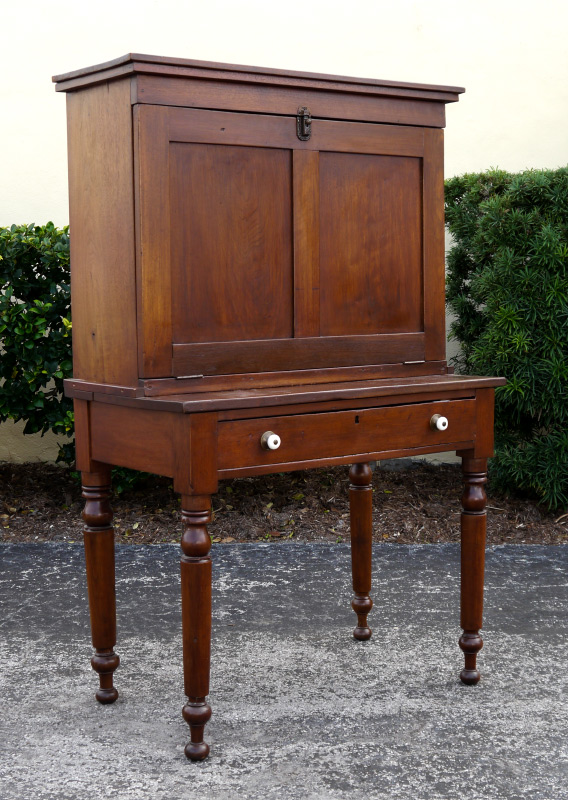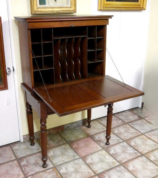 AMERICAN COUNTRY DROP FRONT PLANTATION DESK: Drop front top with pigeon holes and file compartments, single drawer base, turned legs. Overall 57 1/4'' h. x 36'' x 20 1/2''.