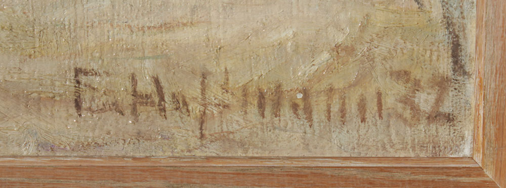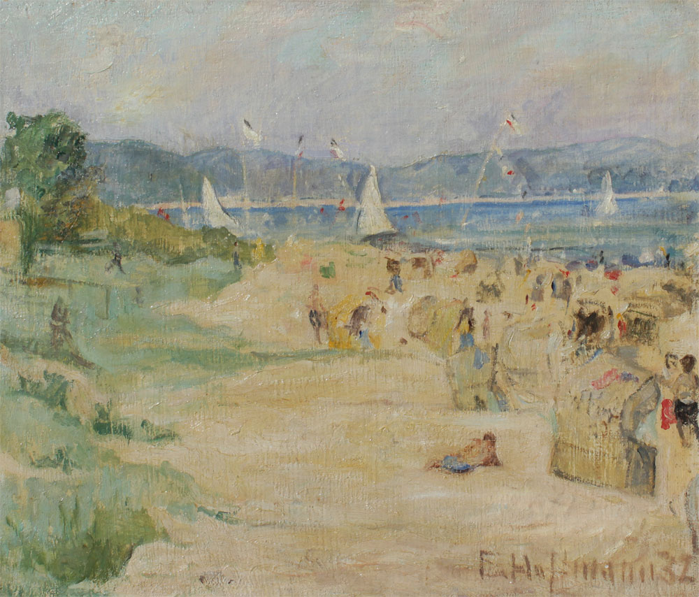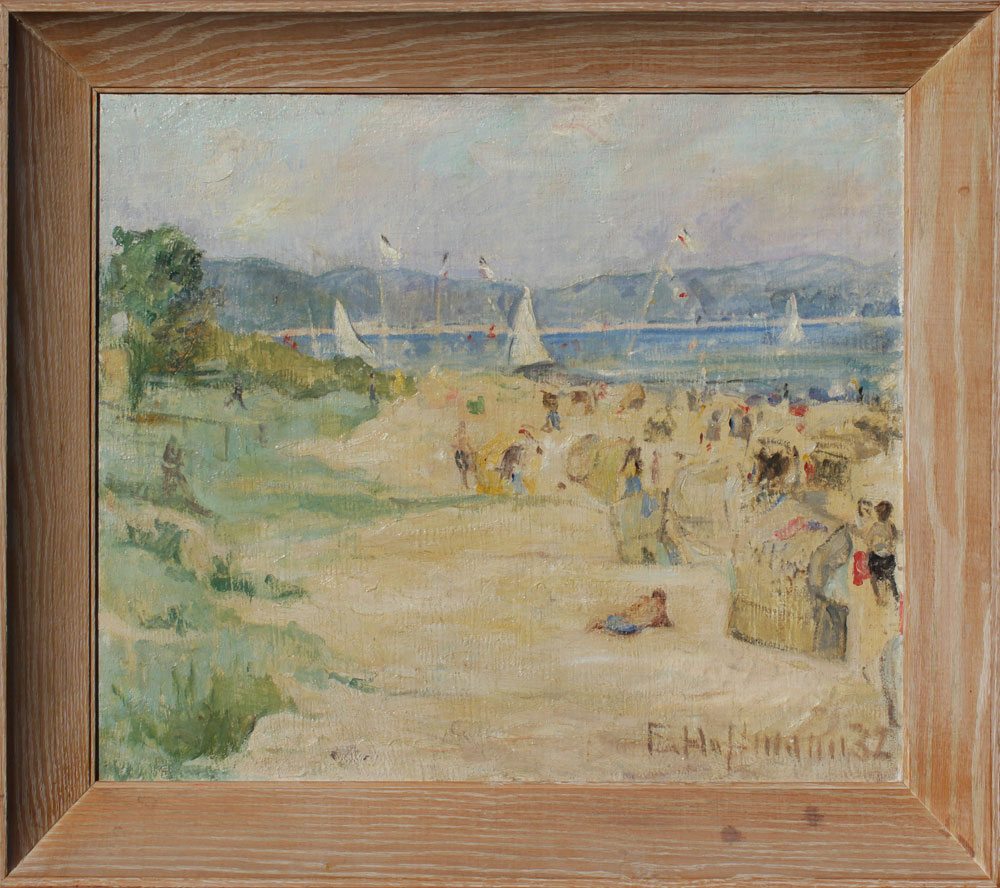 BEACH SCENE OIL PAINTING BY E HOFFMANN: Oil/Canvasboard, 20'' x 24'', signed lower right and dated '32, framed 25'' x 28 1/2''.