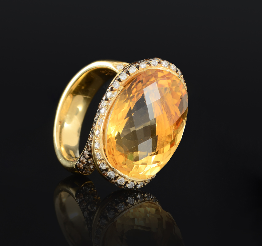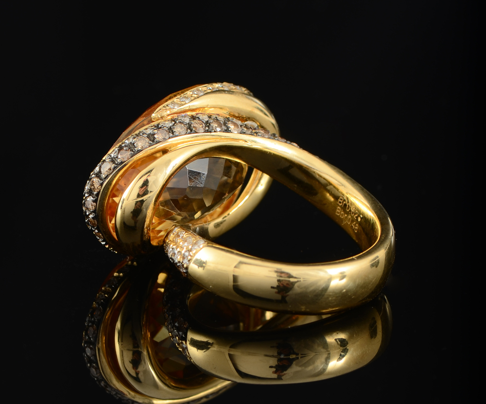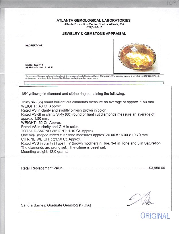 23.5 CT CITRINE RING WITH DIAMONDS RING: 18K yellow gold ring centering the oval checker board cut citrine of VVS clarity, wrapped in diamonds slightly pinkish brown and white in color. Diamonds total approx. 1.0 Ct. Citrine is bezel set, diamonds are prong set. Italian marks. Size 6. Mounting weight: 12 grams. Sold with current Atlanta Gemological GIA graduate's appraisal for $3,950.