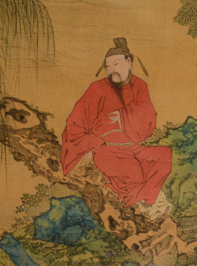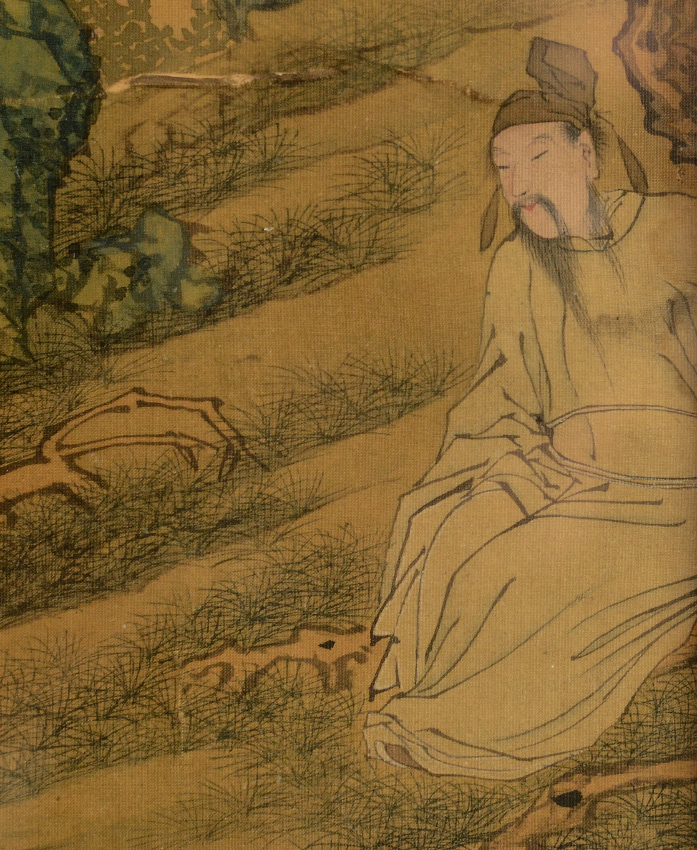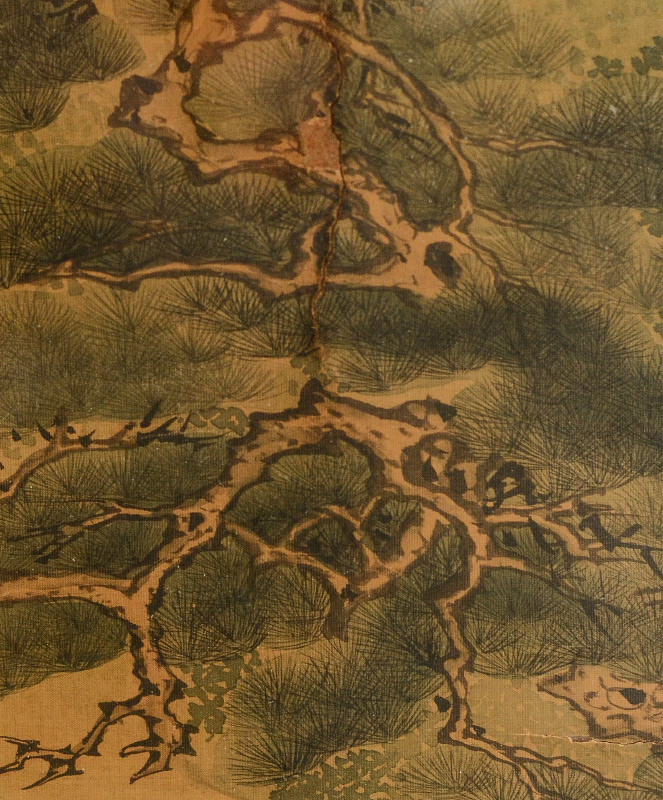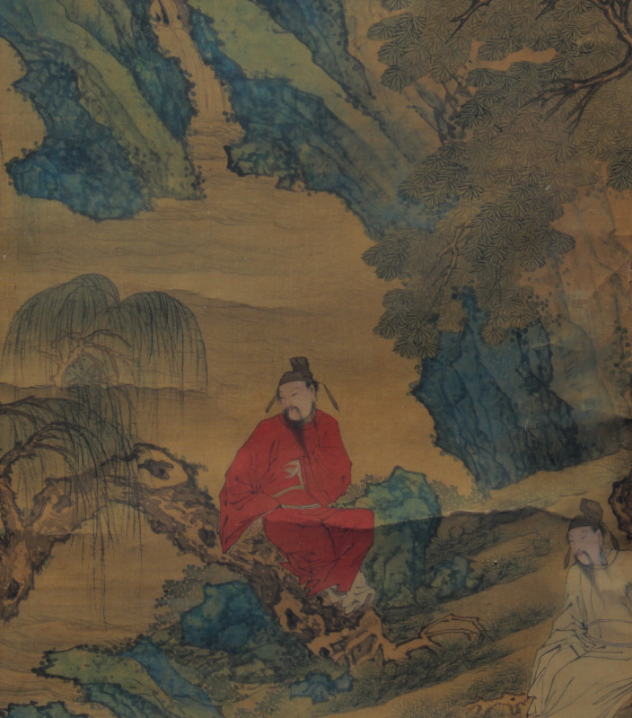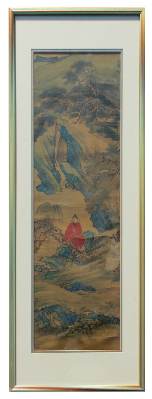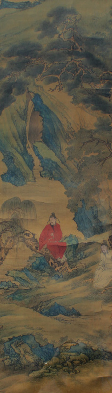 LARGE EARLY ORIENTAL SCROLL PAINTING WITH FIGURES: Watercolor, Depicts several wise men seated in a vast landscape, no visible signature, sight size 31 1/2'' x 10'', framed, 41'' x 16''.