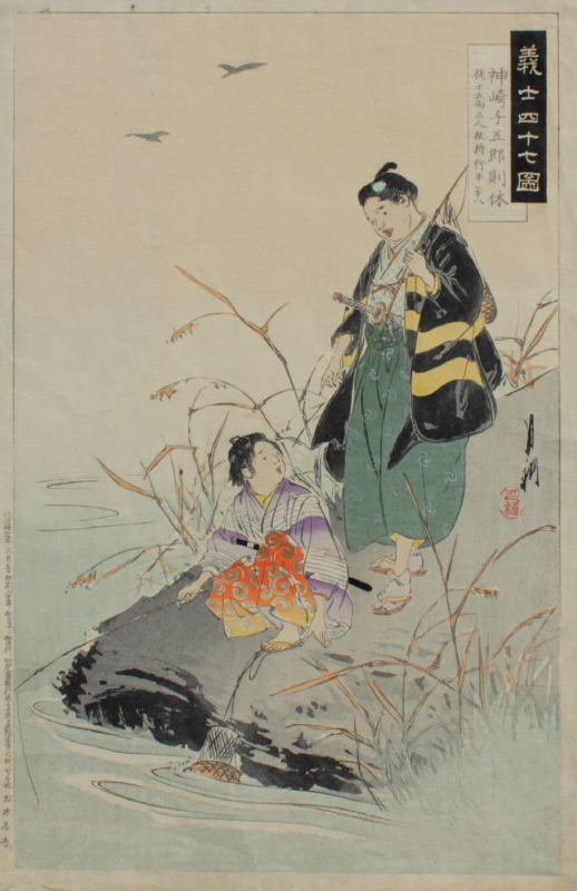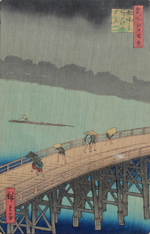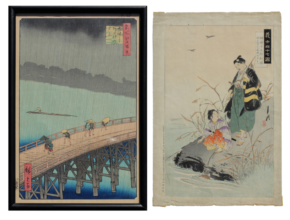 2 PIECE LOT - OGATA GEKKO WOODBLOCK and HIROSHIGE COPY: Gekko 14 1/2'' x 9 7/8'', unframed. Hiroshige sight size 14'' x 9'', framed, 15 1/4'' x 10 1/4''.