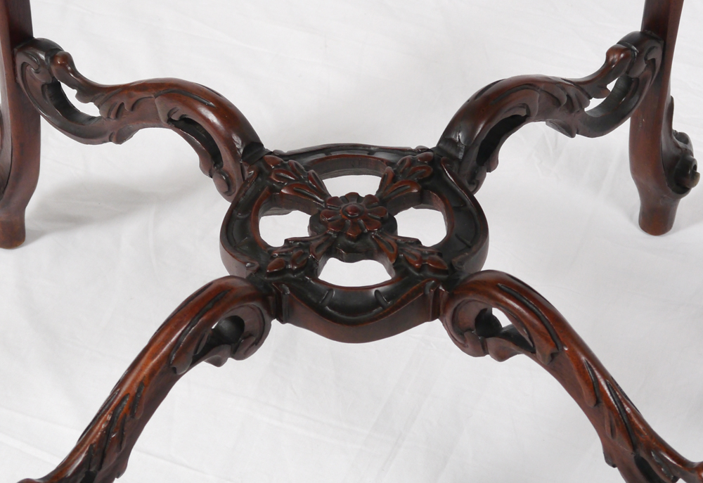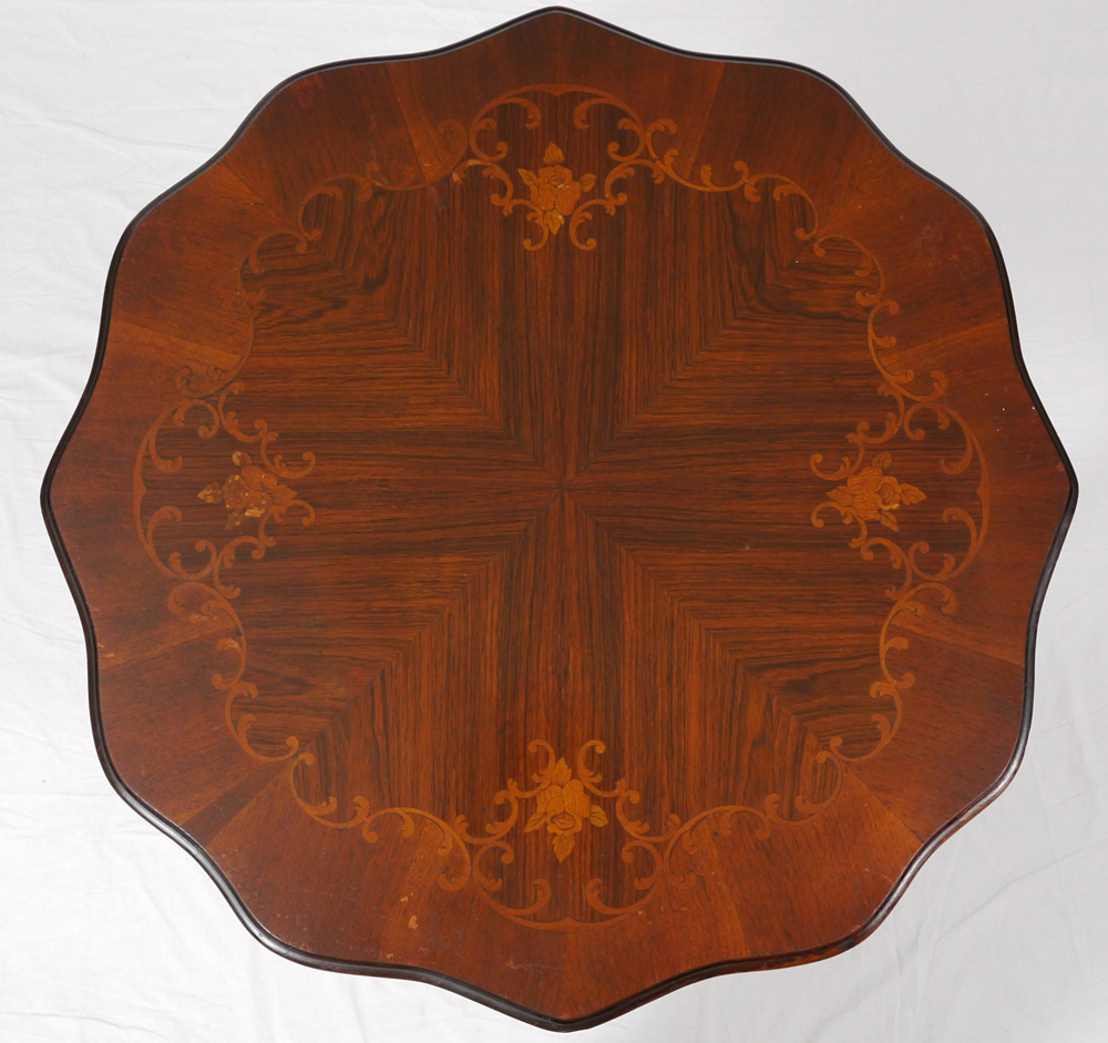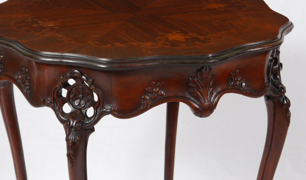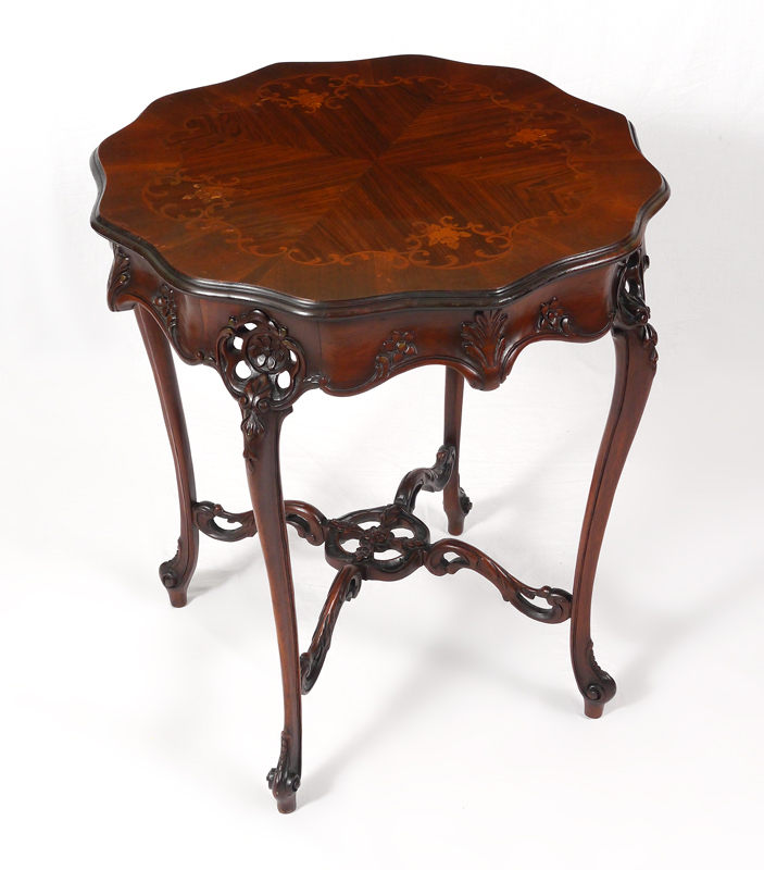 ART NOUVEAU MARQUETRY INLAID TABLE: Early 20th century, marquetry inlaid scalloped edge to top with roses and foliate scroll motif, carved and pierced skirt, shaped legs, carved stretcher. Overall 30 1/2'' h. x 27''.
