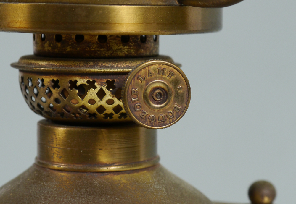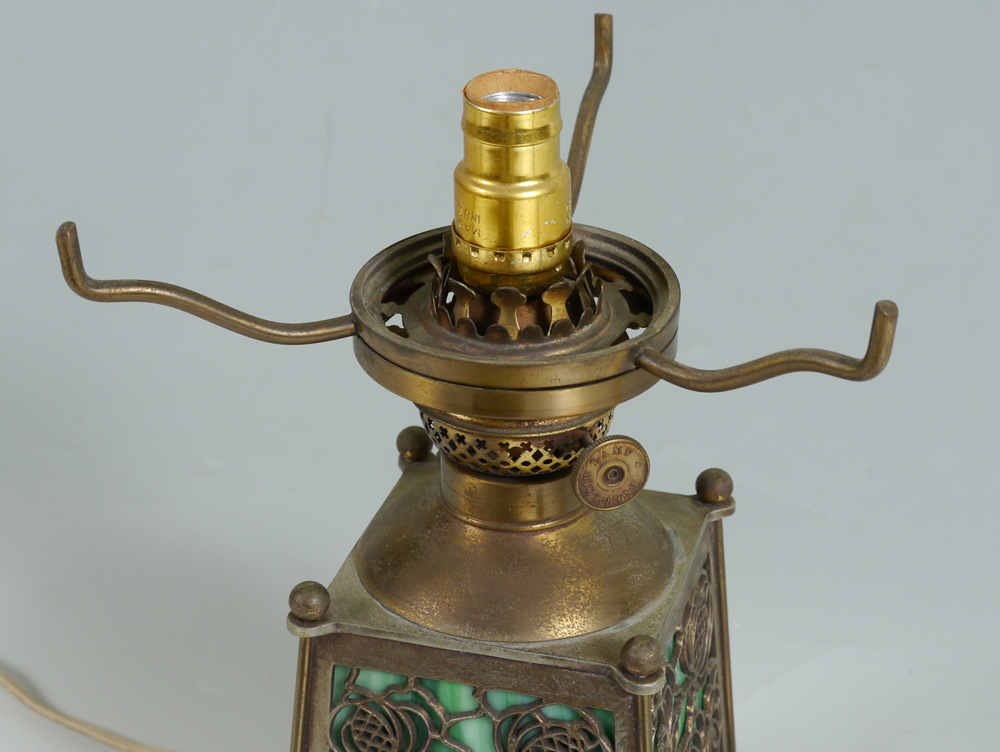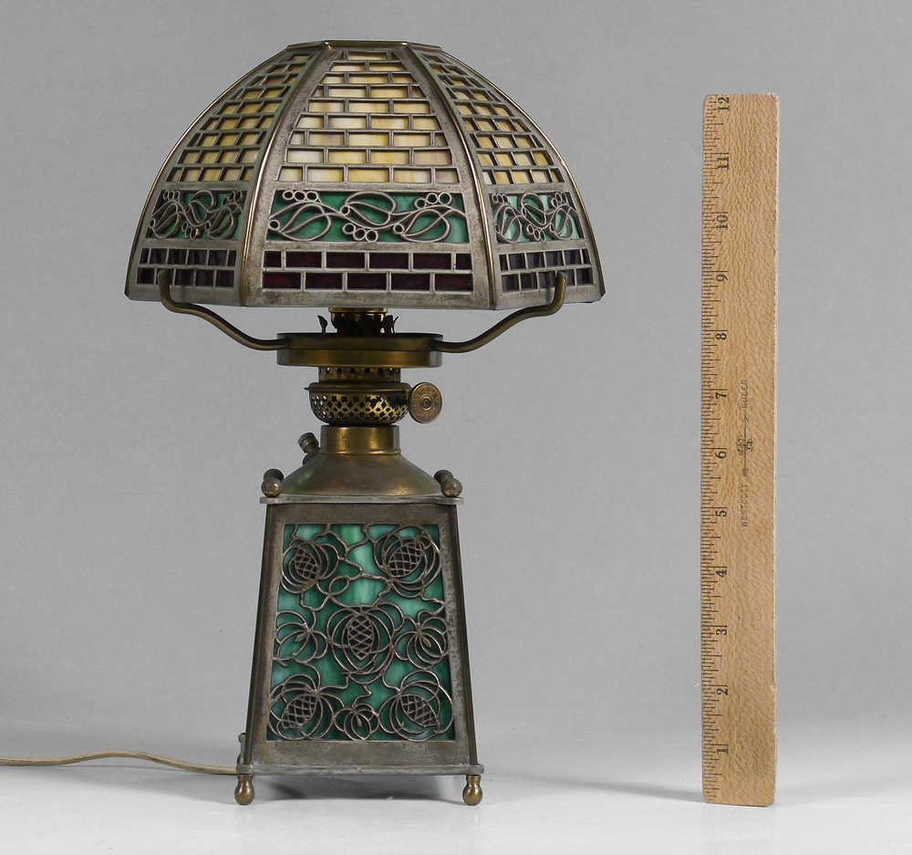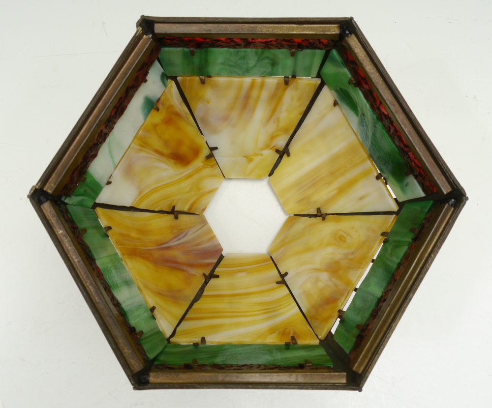 DIMINUTIVE VINTAGE SLAG GLASS TABLE LAMP: Patinated metal base with stylized pinecone motifs, green slag glass inserts, converted electrified fixture including illuminated base. 10 3/4'' h. x 4 1/4''. 6 bent panel slag glass shade, frame with brick and foliate motif, 4 1/2'' h. x 7''.