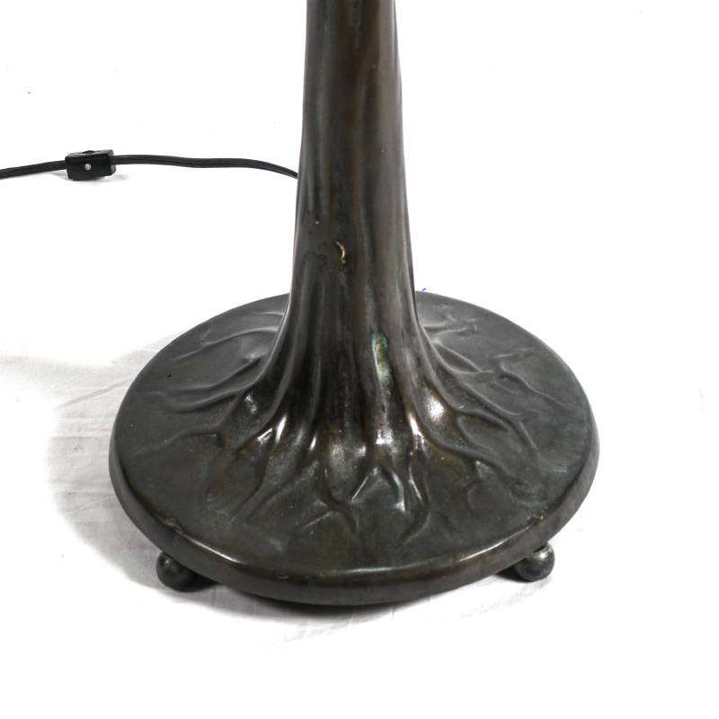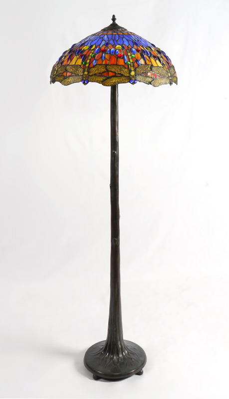 DRAGONFLY LEADED GLASS FLOOR LAMP: Contemporary, patinated metal tree trunk form base, 62'' h. x 12'' dia. Dragonfly motif leaded stained glass shade with hues of yellow, orange and blue, 10'' h. x 22 1/2'' dia.