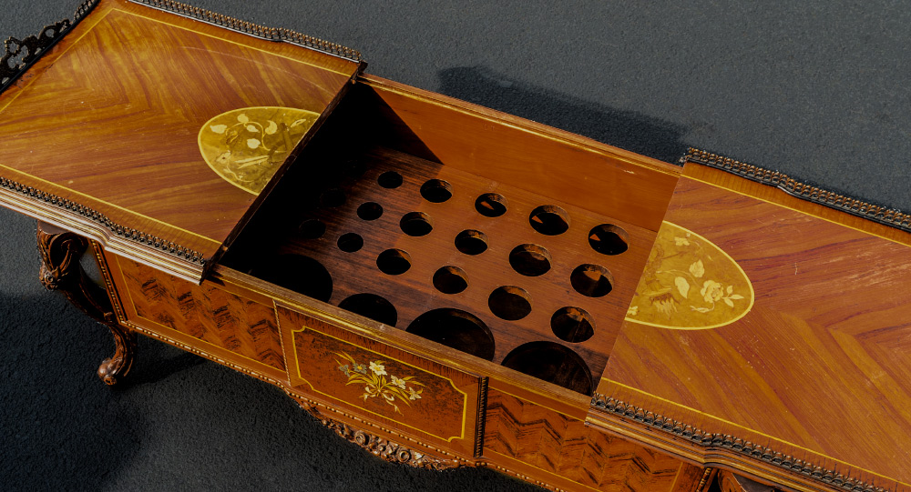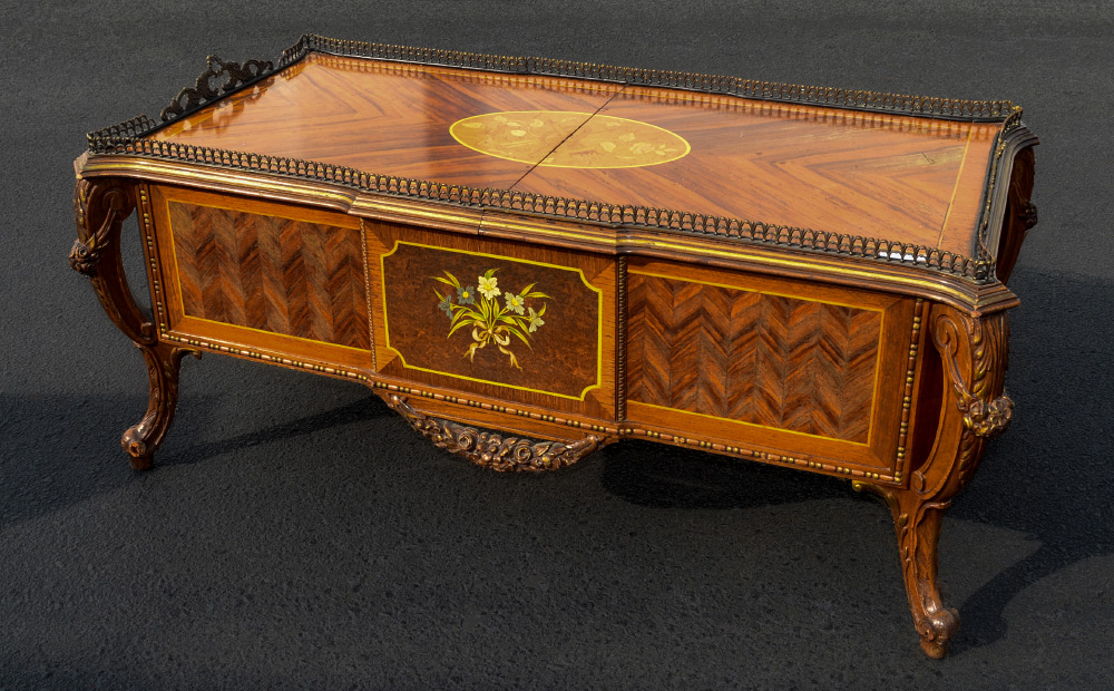FRENCH STYLE INLAID COFFEE TABLE / BAR: Inlaid top with central floral medallion, open work ormolu gallery, slides to reveal storage for bar ware, bottles and glasses. Parquetry and marquetry inlaid sides, carved and shaped legs. Overall measures 18 1/2'' h. x 42 1/2'' x 22''. Sold with a small assortment of bar ware.