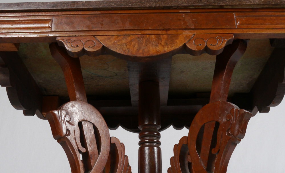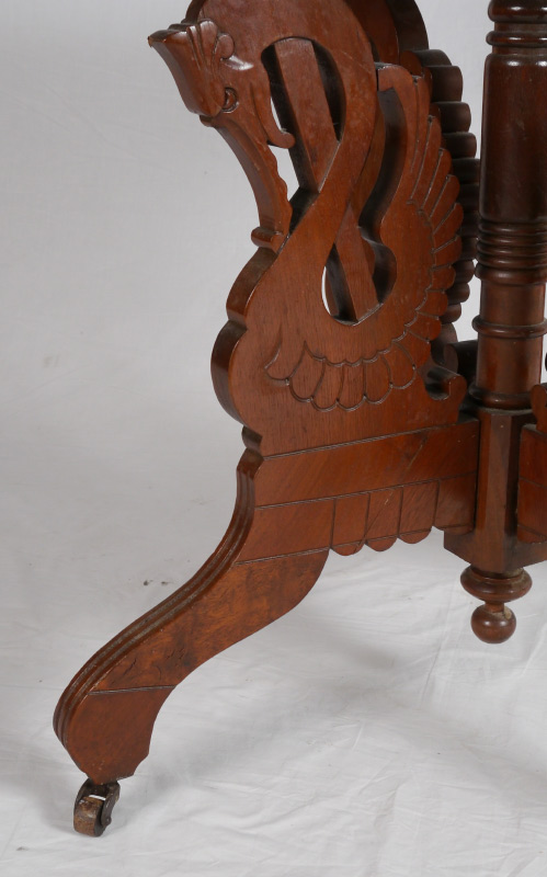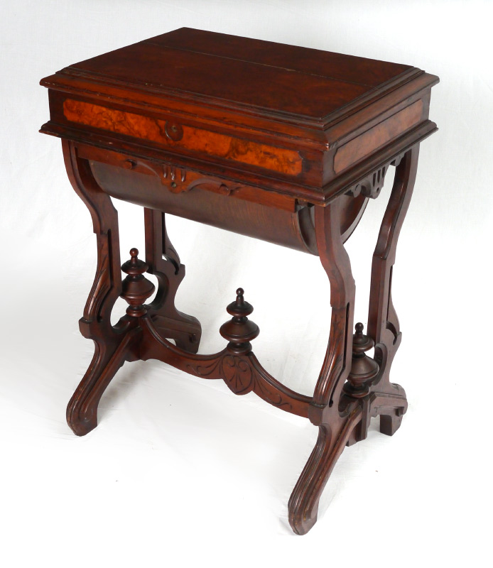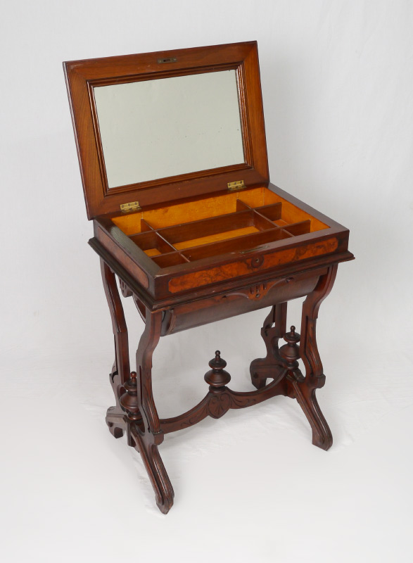 VICTORIAN BURL WALNUT SEWING STAND: Lift top with mirror inside lid, compartmented storage. Lower barrel bottom drawer with carved pull, carved supports and stretchers with spire finials. Overall measures 29'' h. x 21 3/4'' x 15 1/4''.