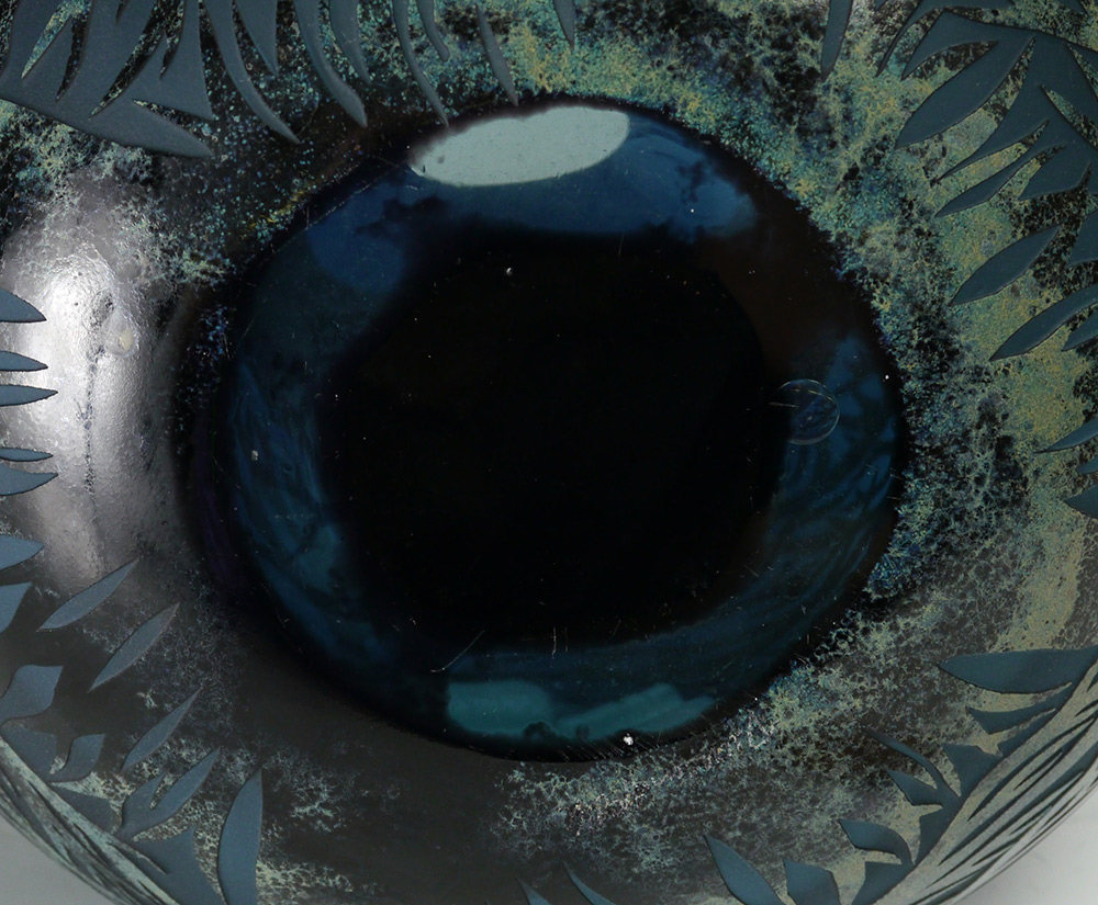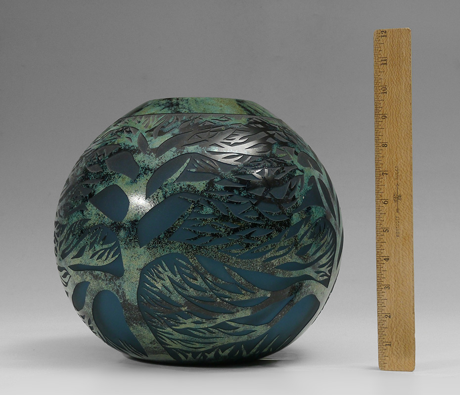 MCCLELLAN, Duncan, (American, 1955-): Mottled green foliate motif studio art glass vase, signed on base. 9 3/4'' h. x 11''