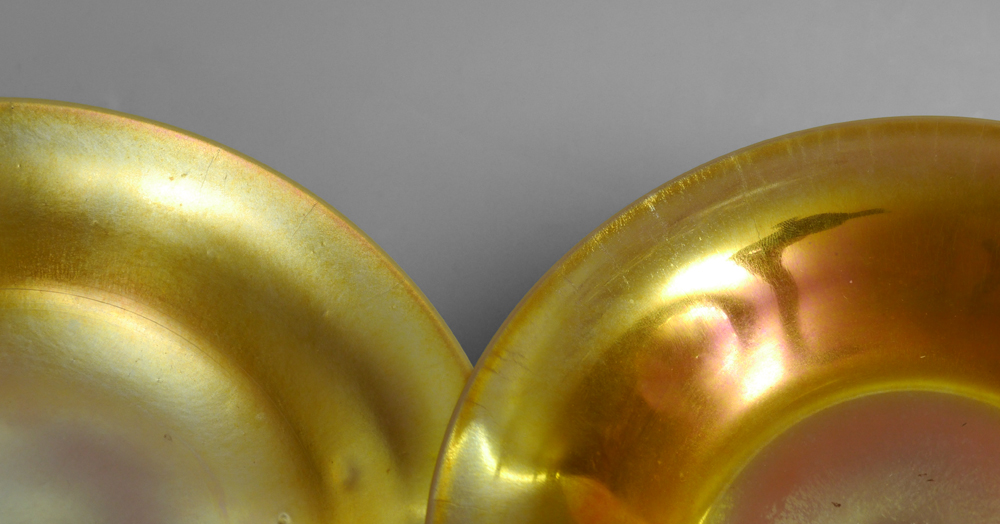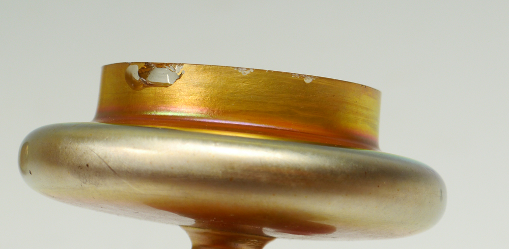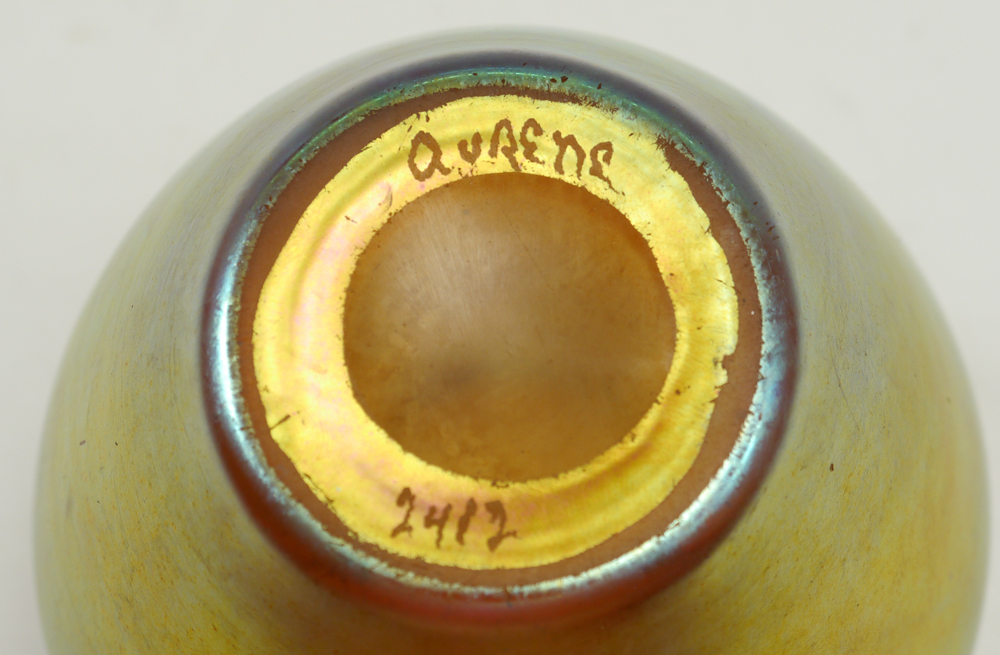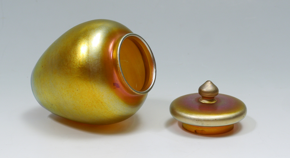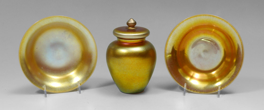 3 PIECE STEUBEN AURENE JAR AND 2 CALCITE BOWLS: 3 pieces total to include 1) Aurene covered jar with lid, marked on base ''Aurene 2412'', measures overall 5 3/4'' h. x 4''. 2-3) Pair gold calcite bowls, unmarked, 1'' h. x 6 1/8''.
