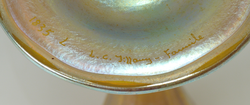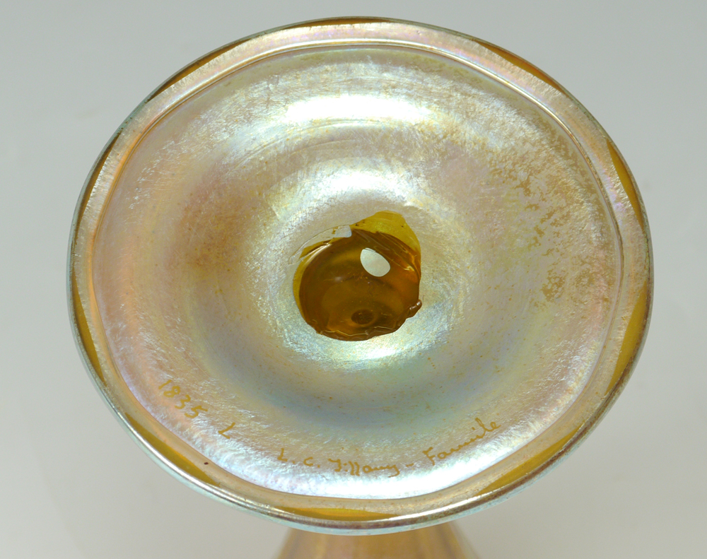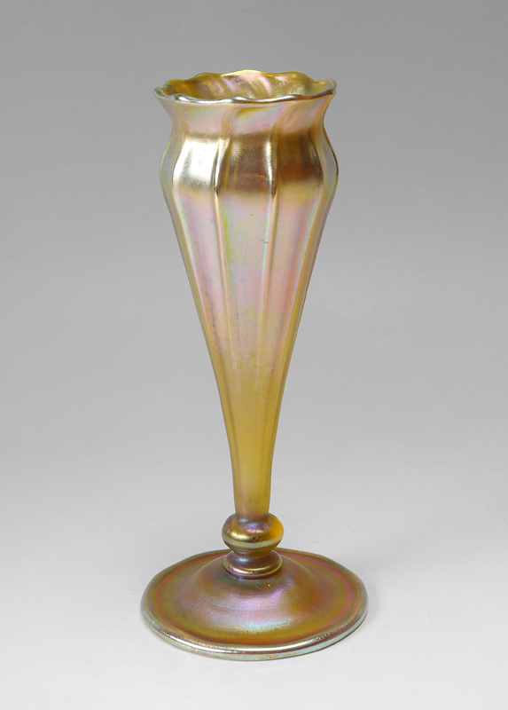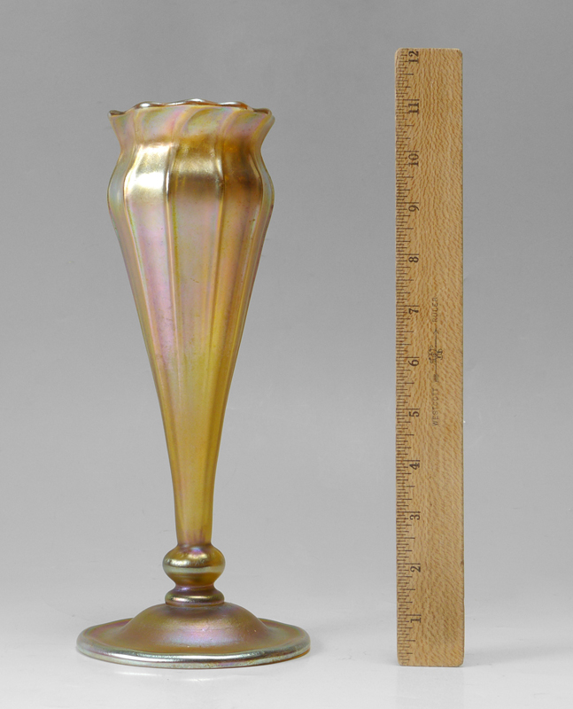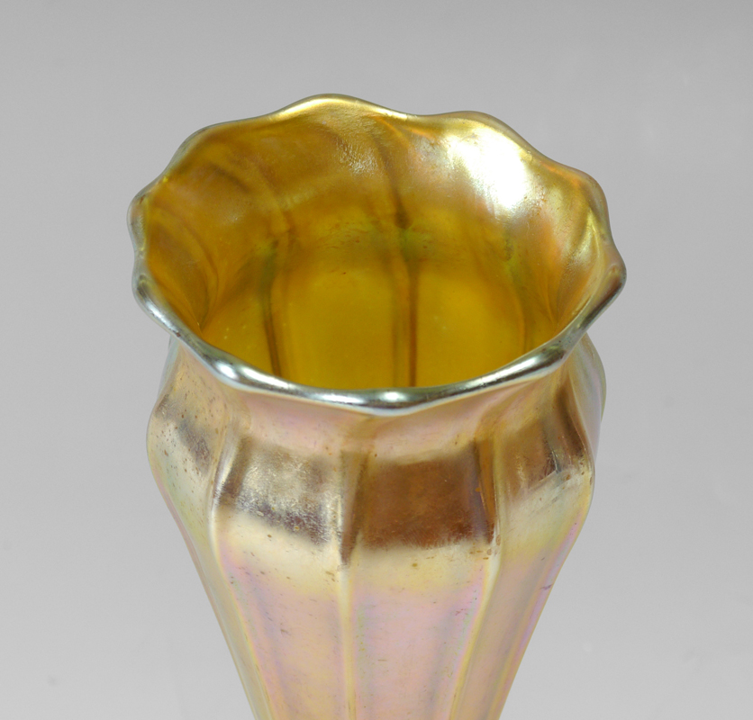 TIFFANY FAVRILE IRIDESCENT ART GLASS VASE: Floriform rim, ribbed body, marked on base ''1835 L L. C. Tiffany - Favrile''. 11'' h. x 4 3/4''.