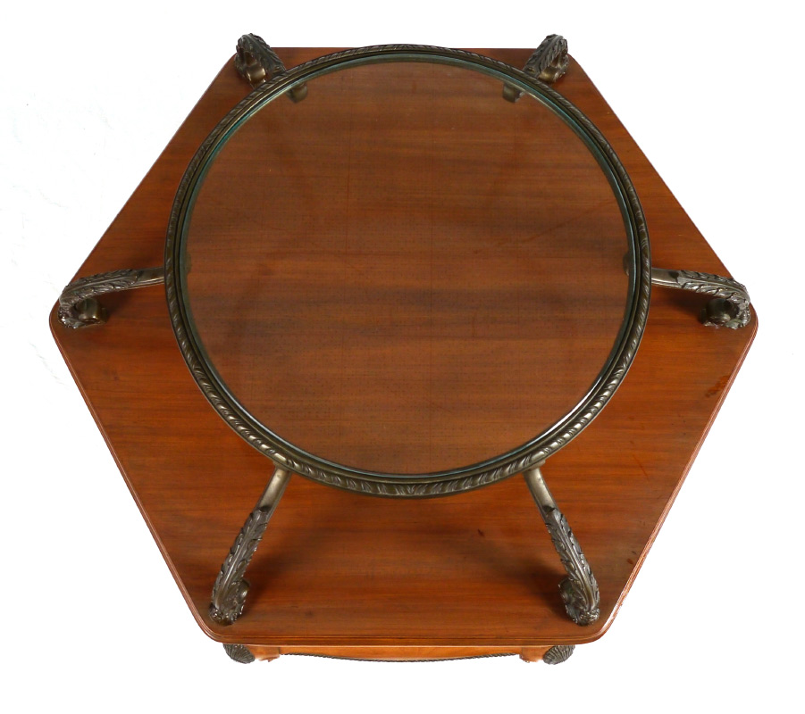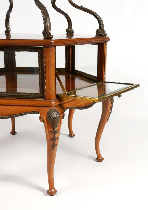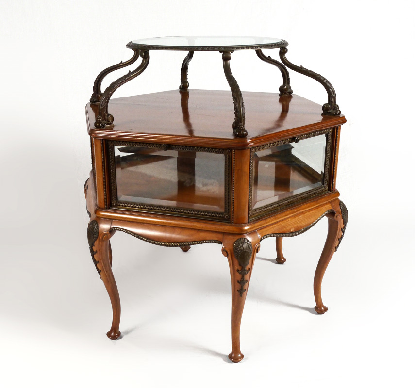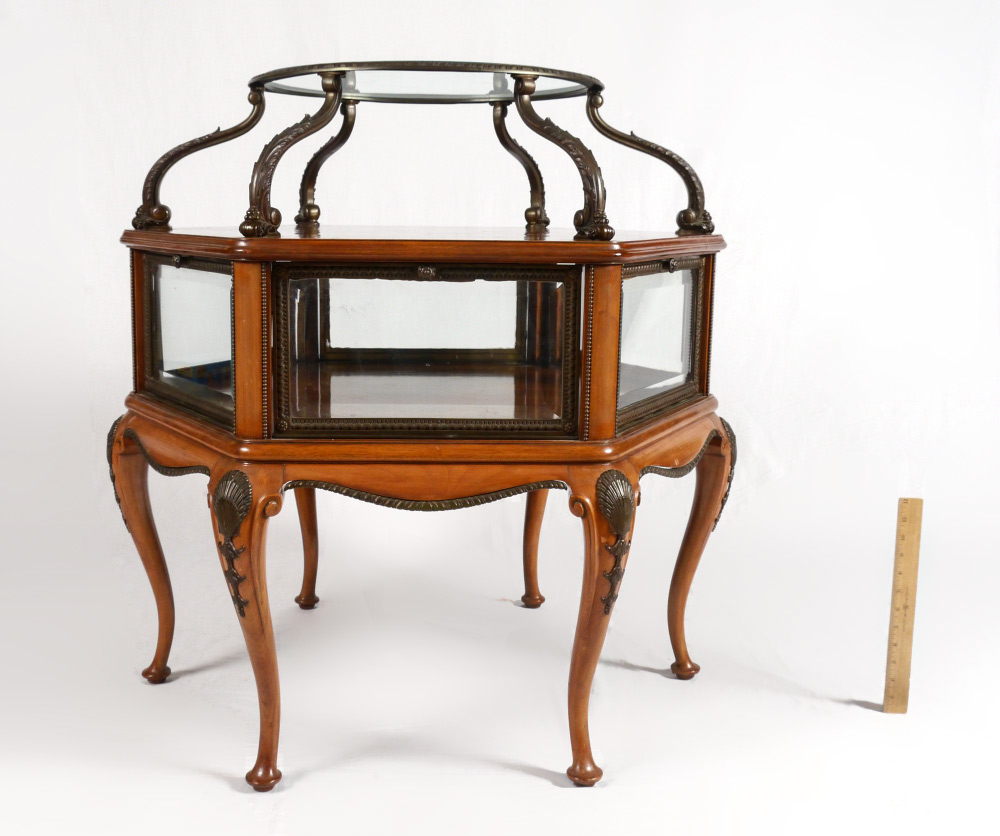 UNIQUE VITRINE DISPLAY OCCASIONAL TABLE: Raised round glass top supported by 6 cast metal supports. 6 sided body with beveled glass side doors for display, shaped legs with applied metal decoration. Overall measures 33 3/4'' h. x 35''.