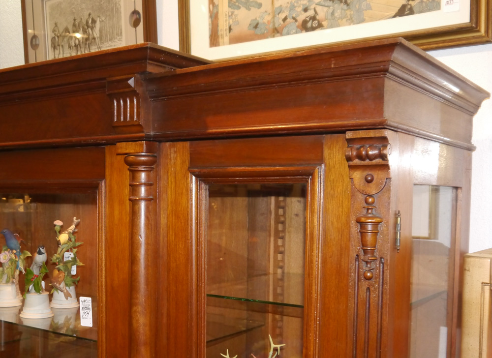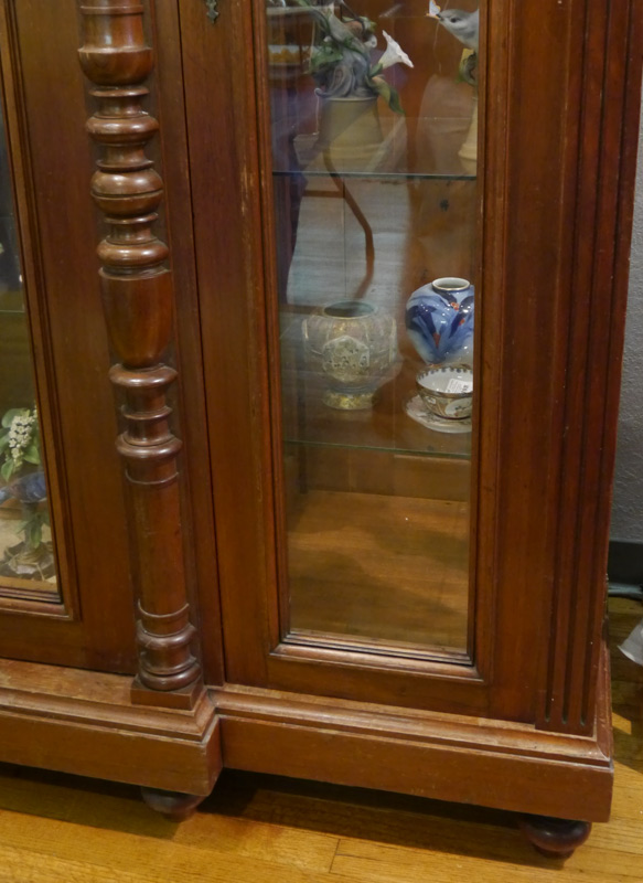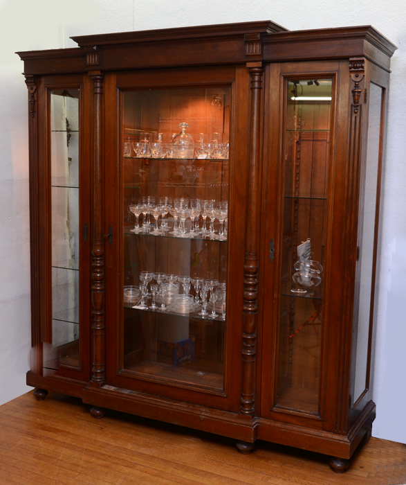 VICTORIAN WALNUT DISPLAY CABINET: Architectural pediment, walnut case with half column stiles and applied decoration. 3 glass door front, glass shelves. Overall measures 87 1/2'' h. x 84'' x 27''.