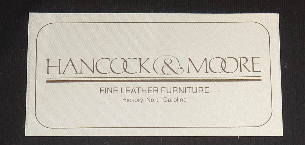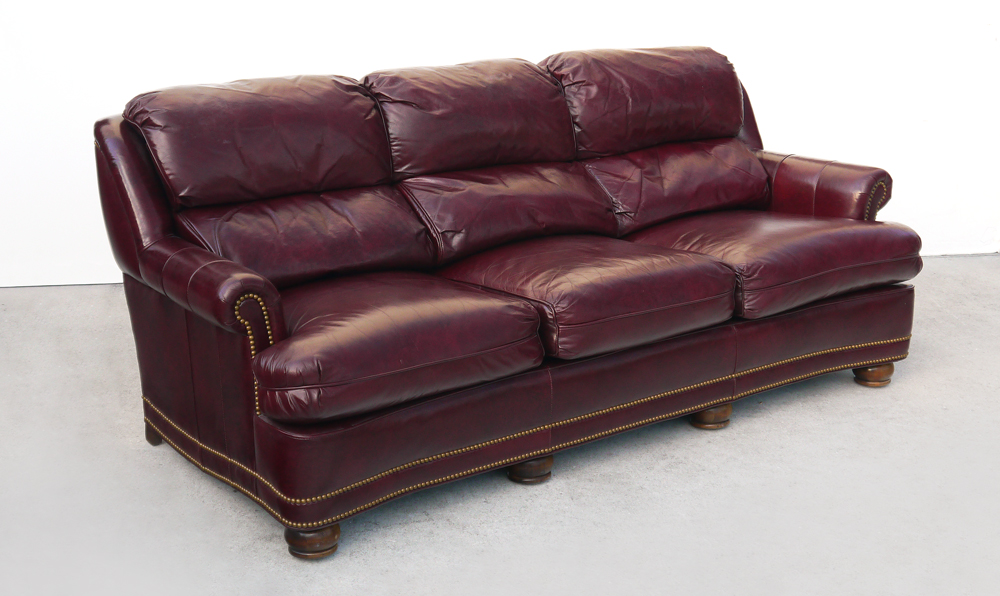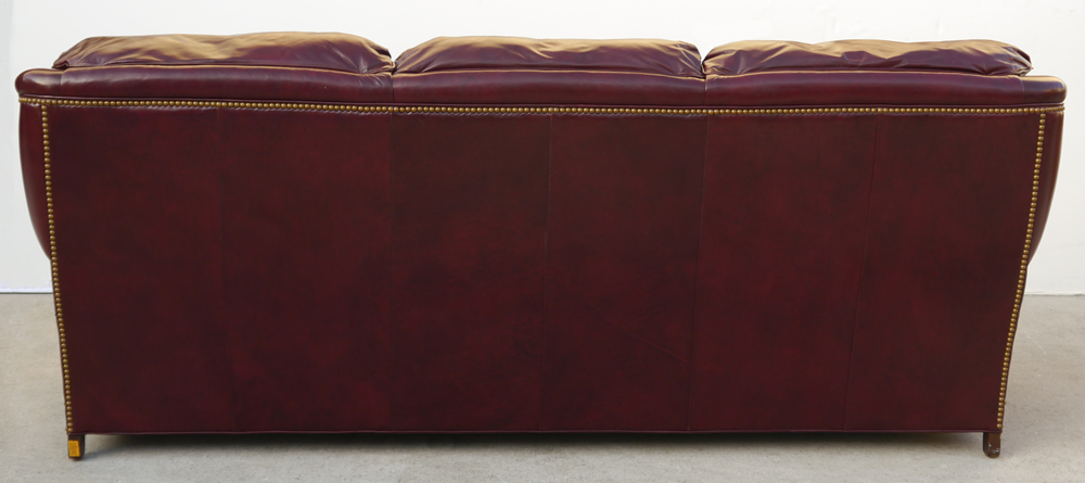 HANCOCK & MOORE LEATHER SOFA: Burgundy leather upholstery, tacked arms, base and back. Overall measures 34 1/4'' h. x 85'' x 39''.