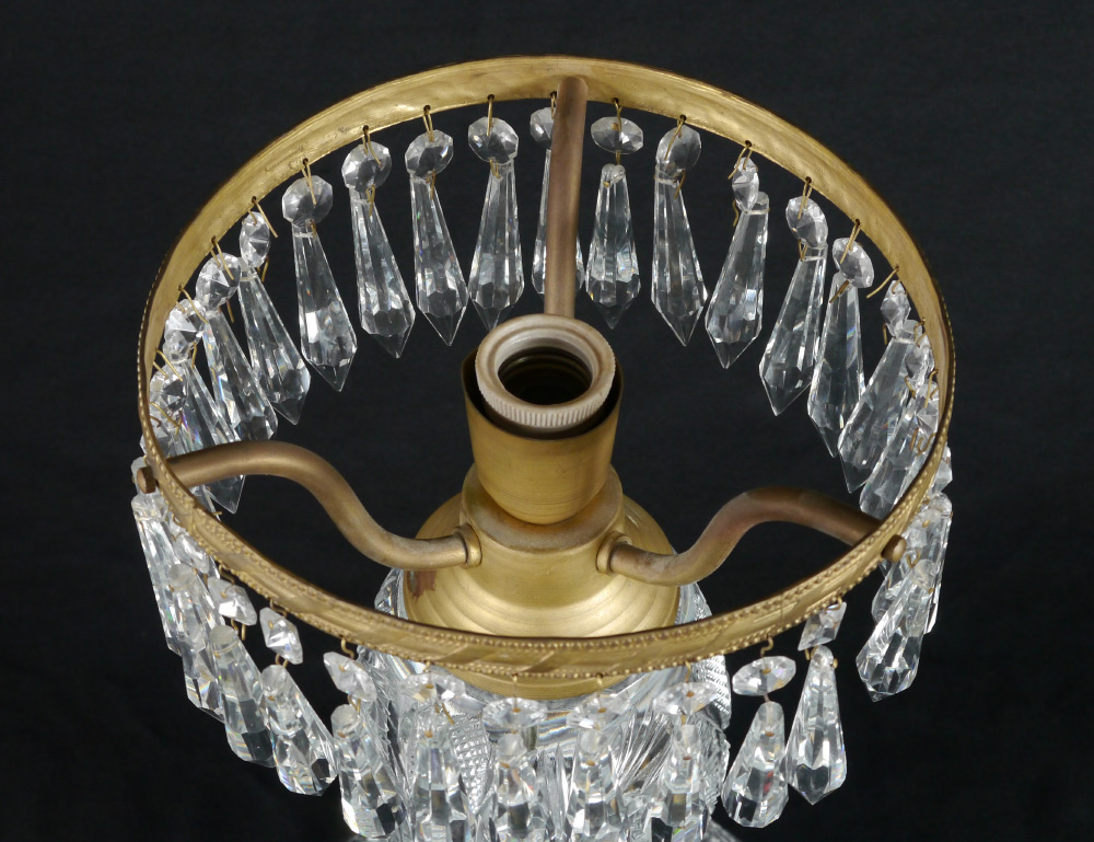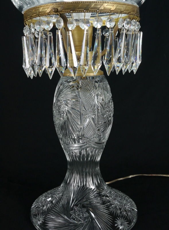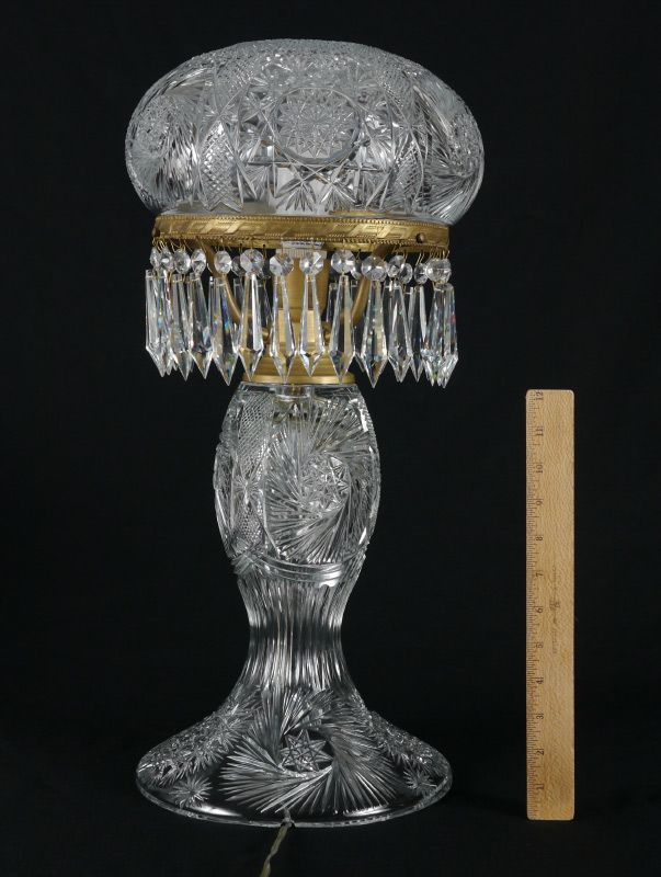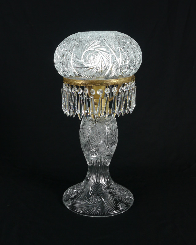 BOHEMIAN CUT GLASS LAMP: Baluster form cut glass body with flared base, mushroom form shade with hanging prisms from metal support. Single socket fixture, overall 22'' h. x 10 1/2''.
