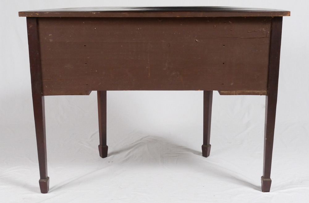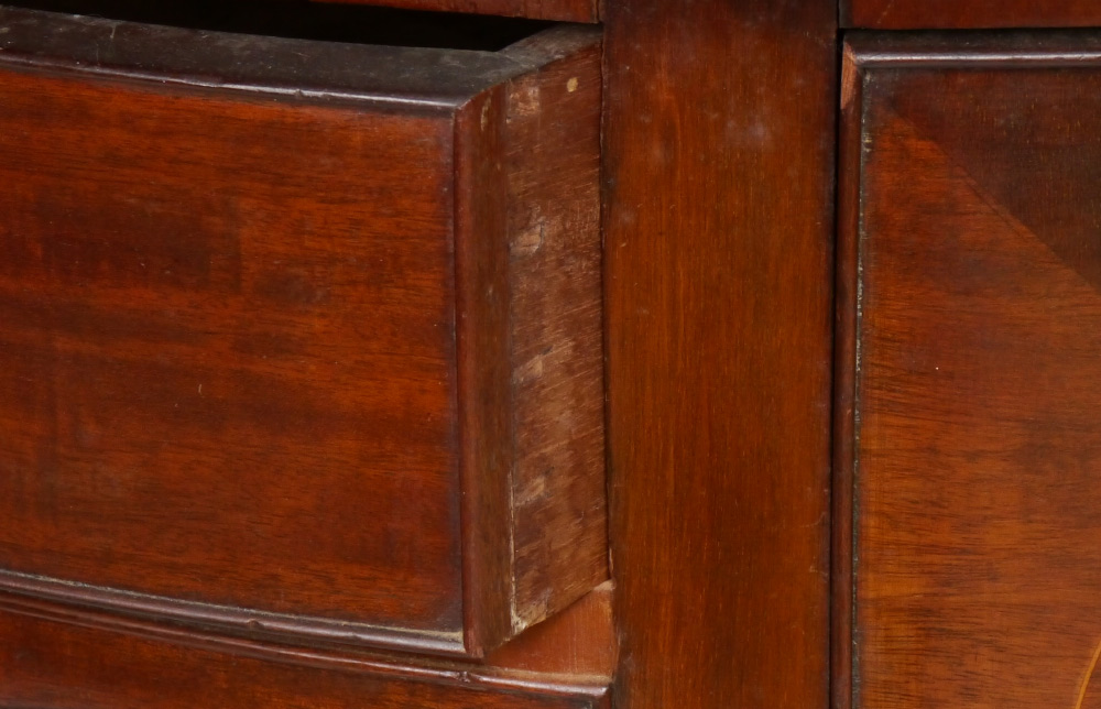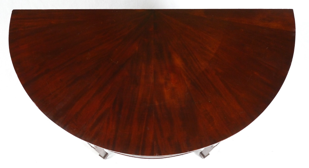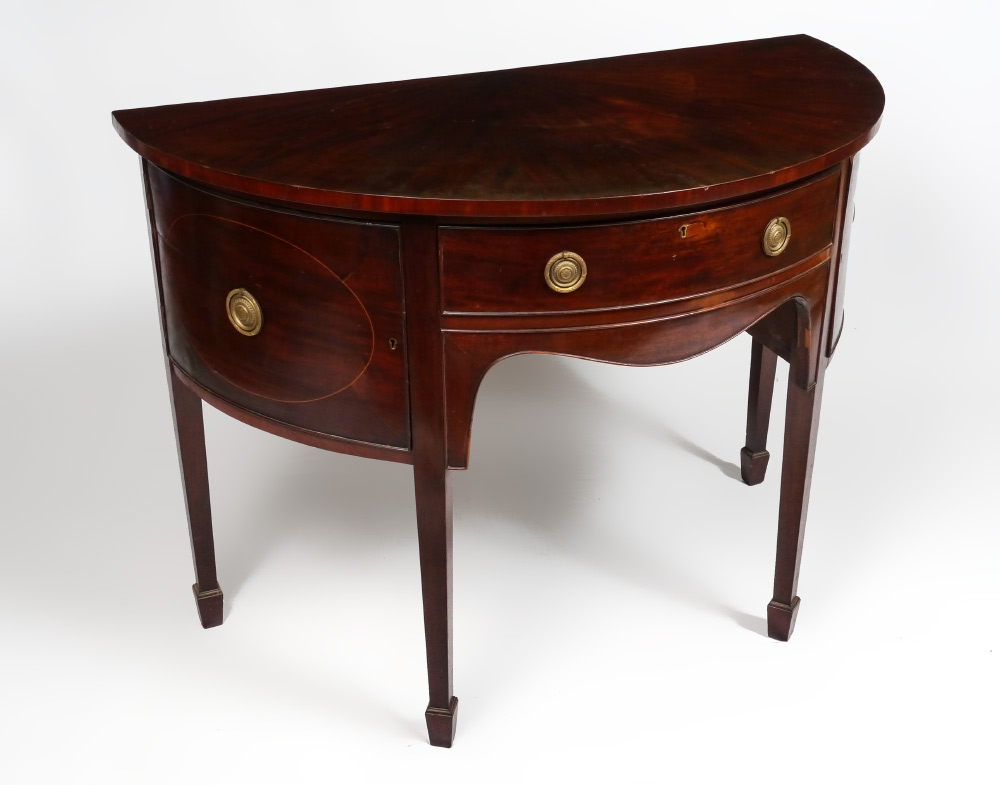 MAHOGANY DEMI LUNE SIDEBOARD: Mahogany veneer, single drawer over shaped skirt, door either side with string inlay. Brass medallion pulls, 34'' h. x 45 3/4'' x 23 3/4''.