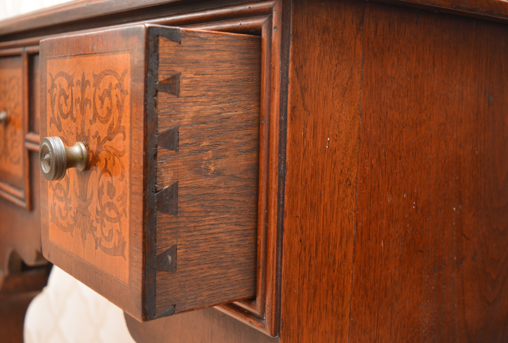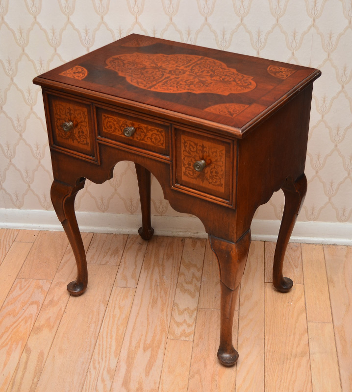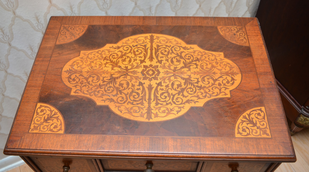 3 DRAWER INLAID STAND: Profusely inlaid with foliate scroll motifs on top and on 3 drawer fronts. Shaped skirt and legs ending in pad feet. Overall measures 29 1/2'' h. x 24 1/4'' x 17 1/4''.