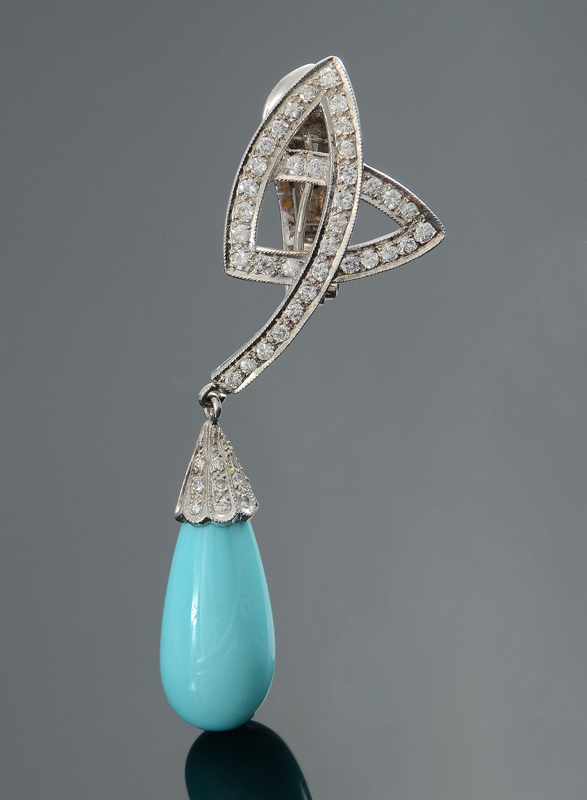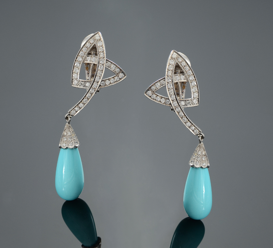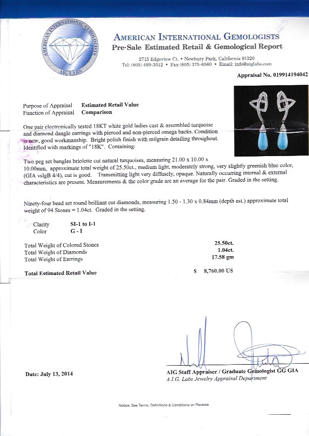 TURQUOISE & DIAMOND DANGLE EARRINGS: 18k white gold earrings with briolette cut natural turquoise, 21 x 10 mm, totaling approx. 25.50 Ct. The 94 round brilliant diamonds total approx. 1.04 Ct., rated SI1-I1 clarity and G-I color. Omega pierced or non-pierced clips. Length, 2 1/4''. Weight 17.58 grams. Sold with AIG GIA graduate gemologist appraisal for $8,760.