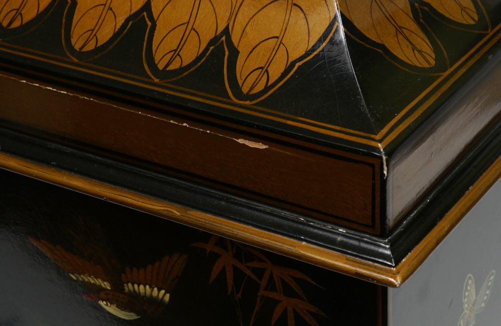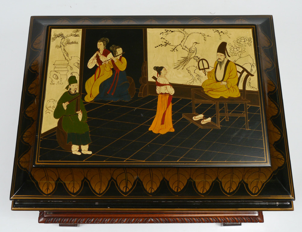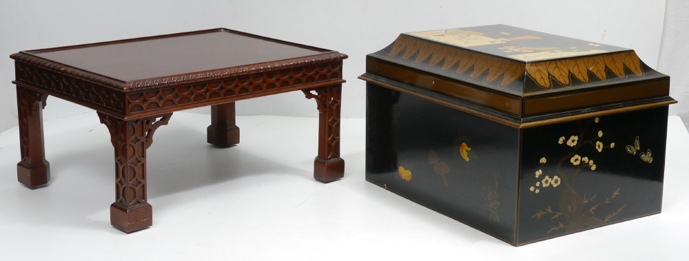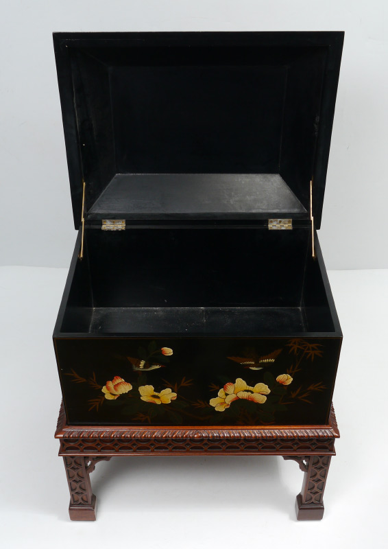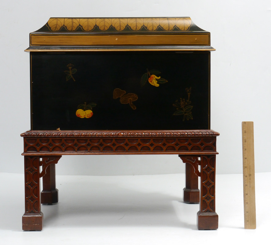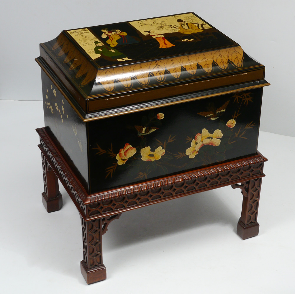 MAITLAND SMITH CHINOISERIE BOX ON STAND: Hand painted Chinoiserie hinged box rests on a carved mahogany Chinese Chippendale style stand. Overall measures approx. 24'' tall x 21'' x 16''.