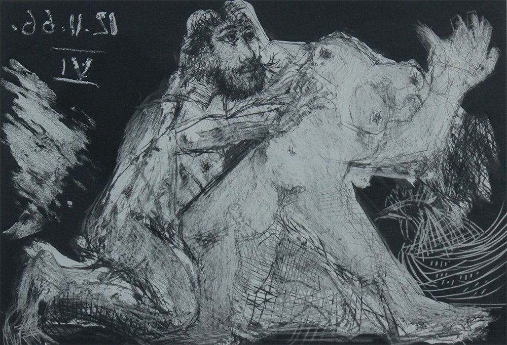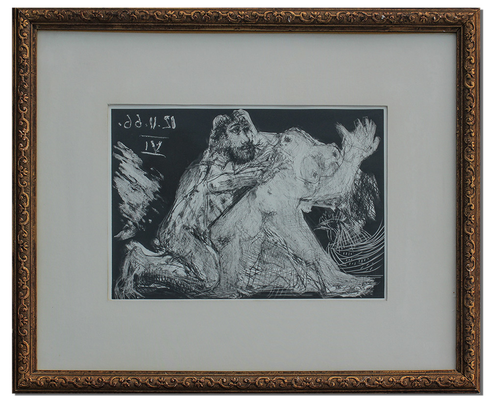PICASSO, Pablo, (Spanish, 1881-1973): ''Viol, Avec un Coq'', 1968, [Seduction] from Le Cocu Magnifique, Plate XII, Aquatint, Etching, and Drypoint, sight size 8 3/4'' x 12 3/4, framed, 18'' x 22''. Le Cocu Magnifique (The Splendid Cuckold) is an illustration of the 1921 play by Belgian playwright and friend Fernand Crommelynck. The title refers to the cuckoo bird who commonly laid her eggs in other bird's nests and the play revolves around the tribulations of love and adultery. Picasso composed the theatrical scenes in a stage-like setting even to the point of including the proscenium arch (the opening between the stage and the audience). The themes, selected by the artist reveal Picasso's use of erotic sequences making use of his dramatic line and mastery of aquatint. Though Picasso saw the play many years earlier, he did not focus on the series of etchings until 1968, and then chose Crommelynck's son Aldo, as the master printer for the project. Picasso spent his last years at Aldo's workshop at Mougins creating some of his most superb graphic images (Oglethorpe University Museum of Art).