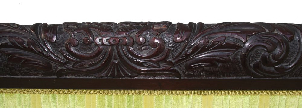 HORNER ERA FINELY CARVED MAHOGANY SOFA: Ornately carved straight back sofa, solid panel arm supports. Later upholstery and side cushions. 35 1/2'' x 75'' x 30
