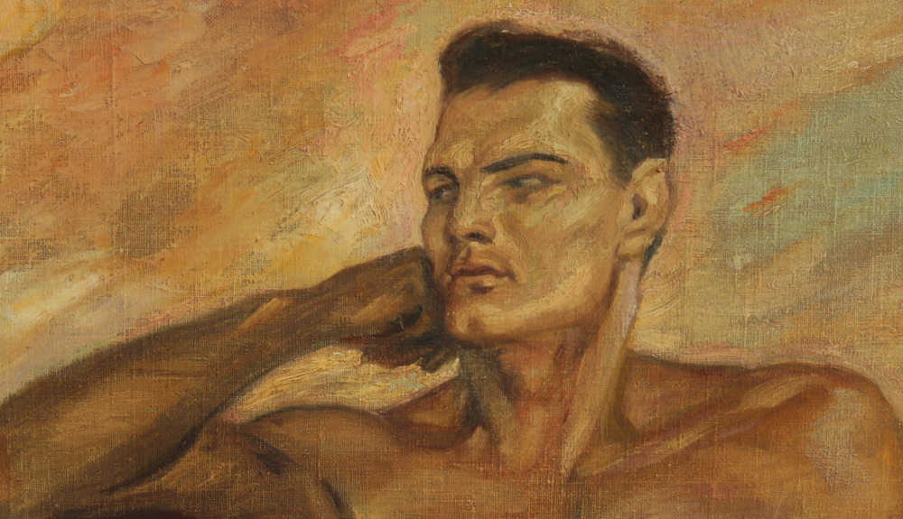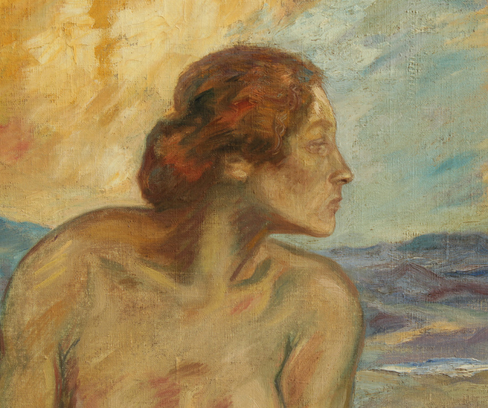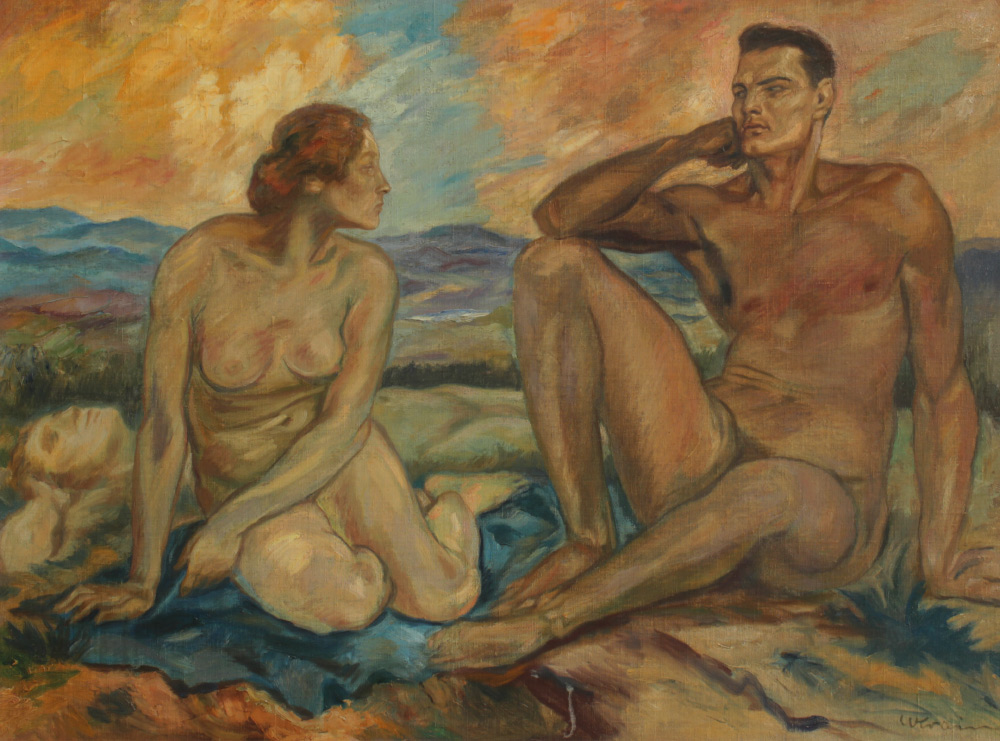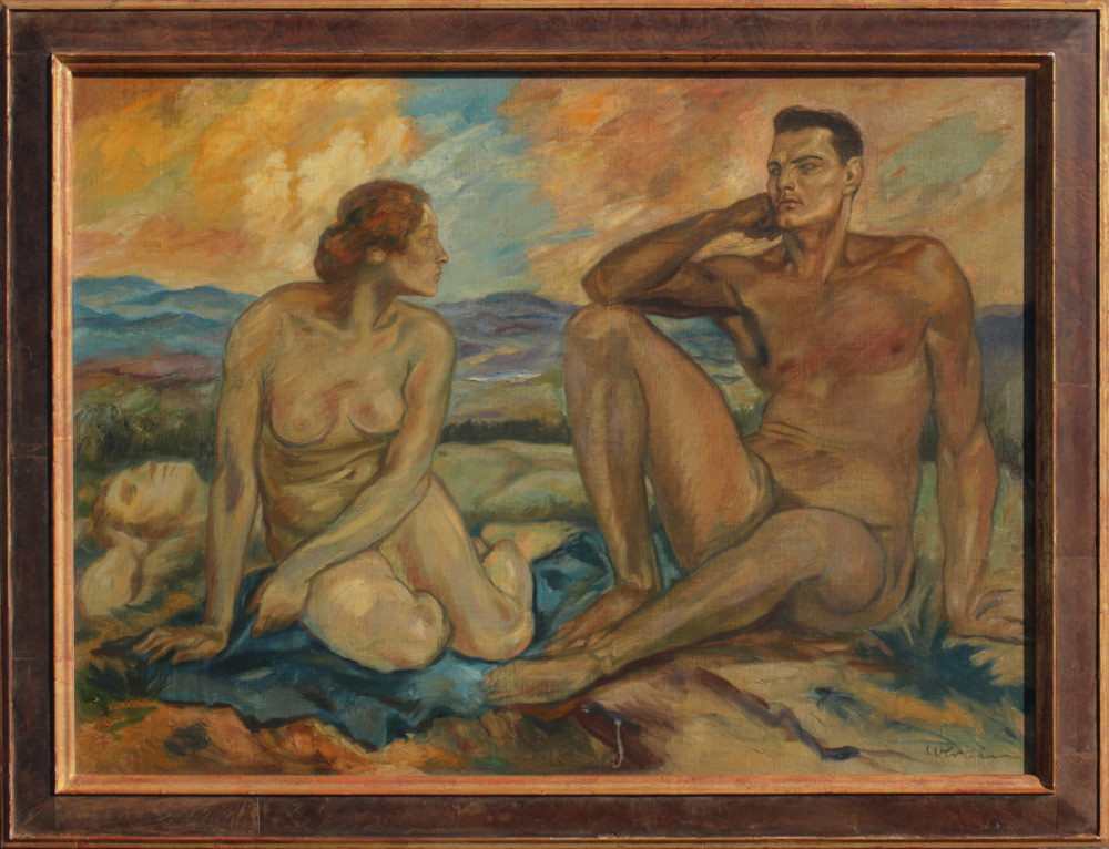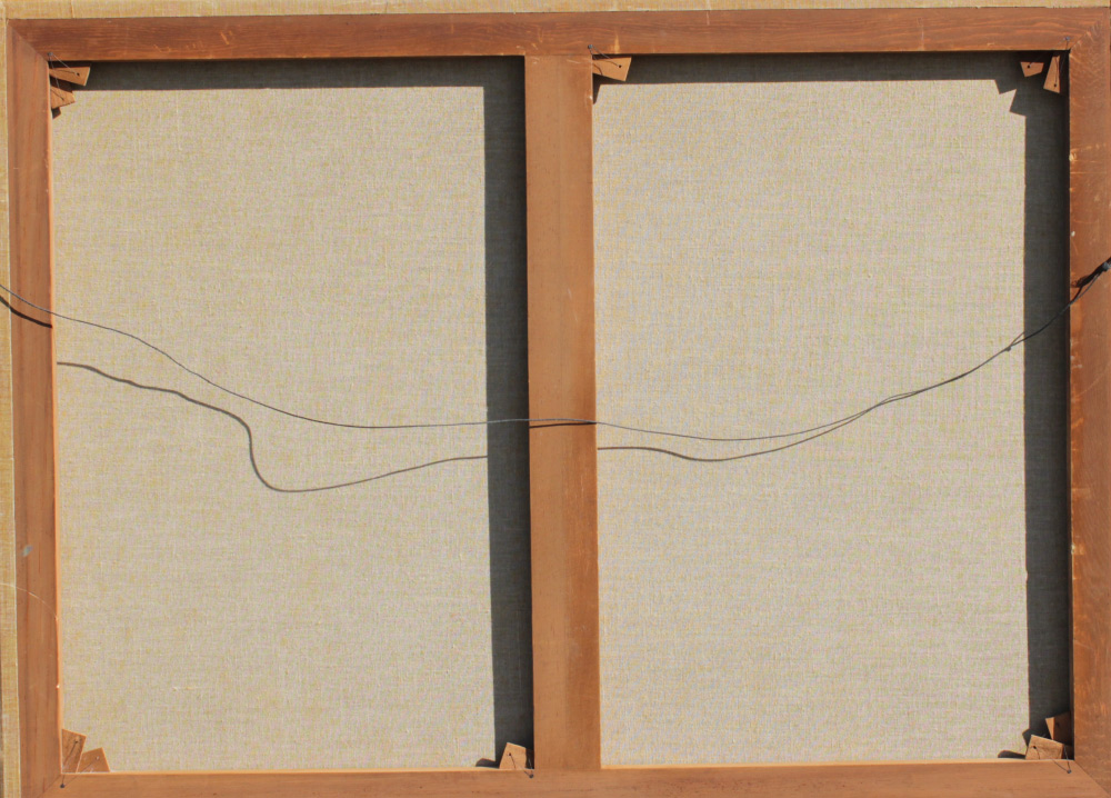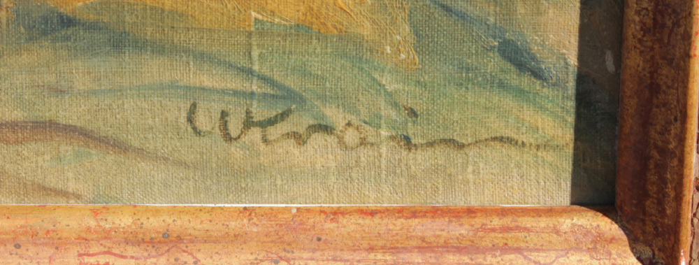 LARGE MODERNIST BATHERS PAINTING ILLEGIBLY SIGNED: Oil/Canvas, 32'' x 43 1/2'', signed lower right, fine custom framing, 38 1/2'' x 50''.