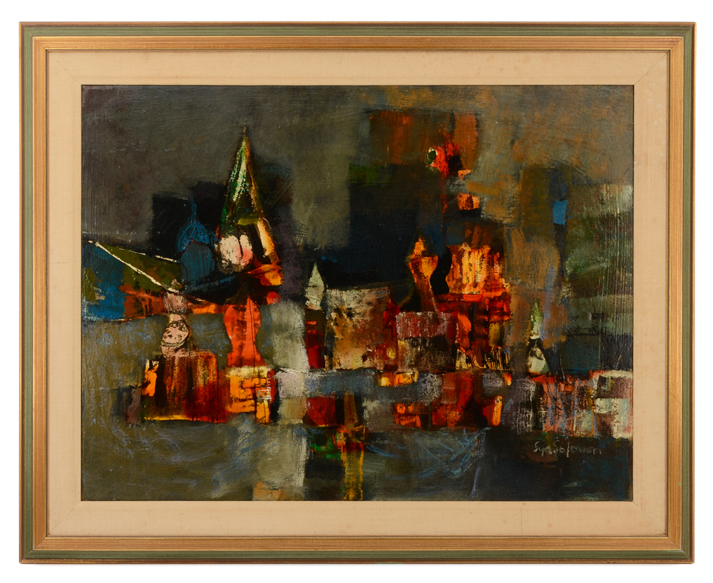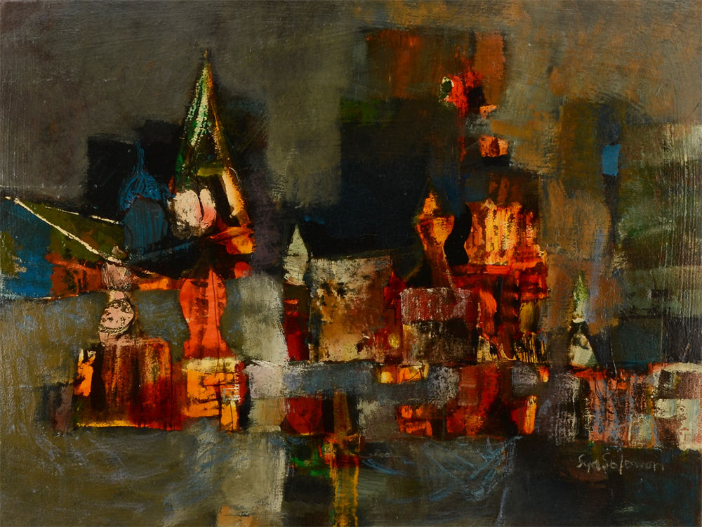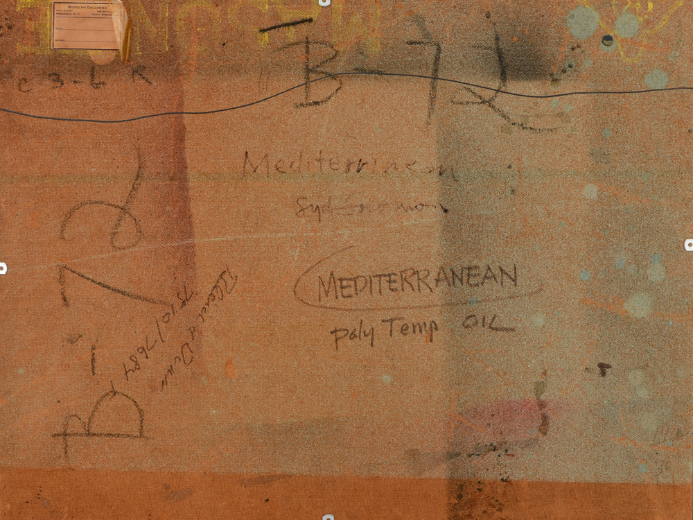 SOLOMON, Syd, (American, 1917-2004): : ''Mediterranean'', Poly Temp Oil/Masonite, 23 3/4'' x 31'', signed lower right, Rudolph Galleries label affixed verso, framed, 30'' x 37 1/2'', titled and signed verso.