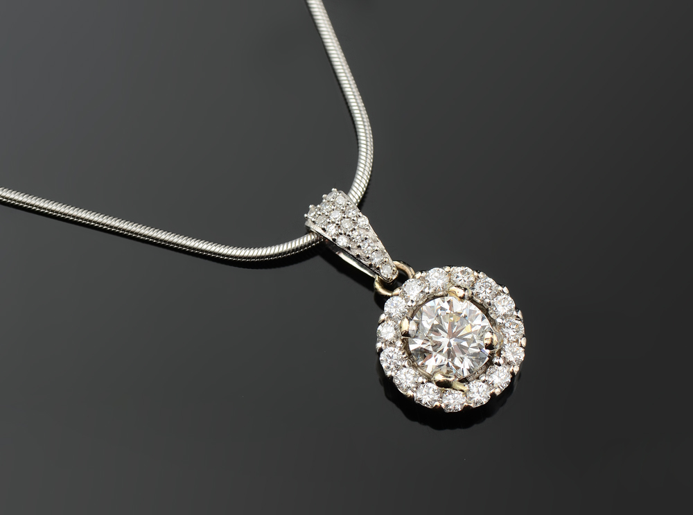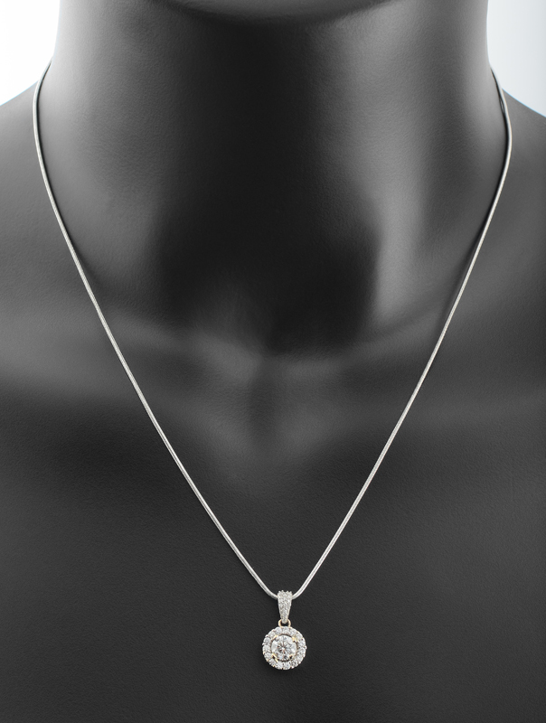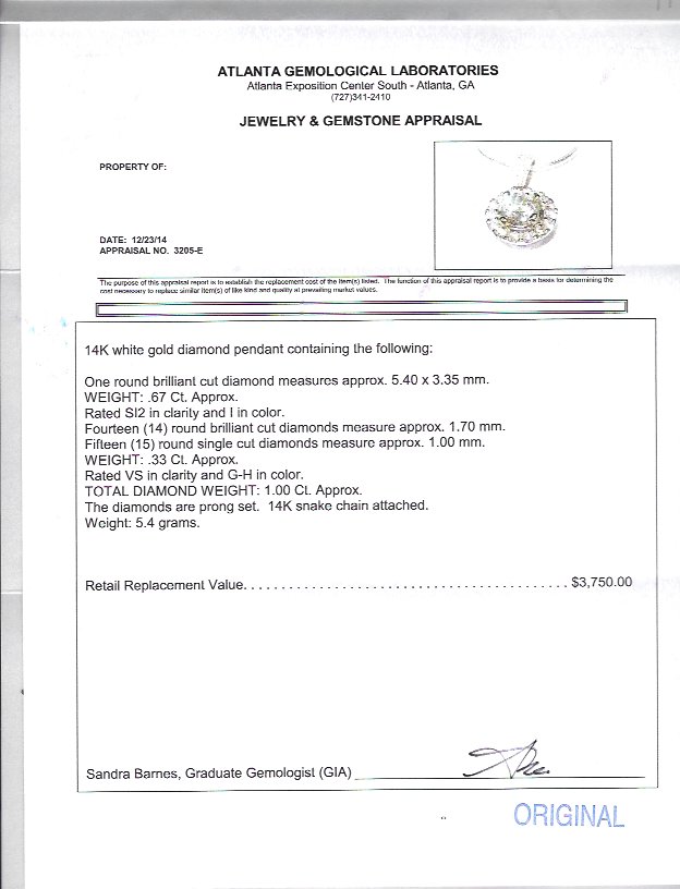 DIAMOND HALO PENDANT NECKLACE: 14K white gold necklace, the pendant centering a .67 Ct solitaire with the halo and bail having 29 round brilliant and round single cut diamonds totaling approx. .33 Ct. The 14K snake chain is 18''. Weight 5.4 grams. Sold with current Atlanta Gemological GIA graduate's appraisal for $3,750.