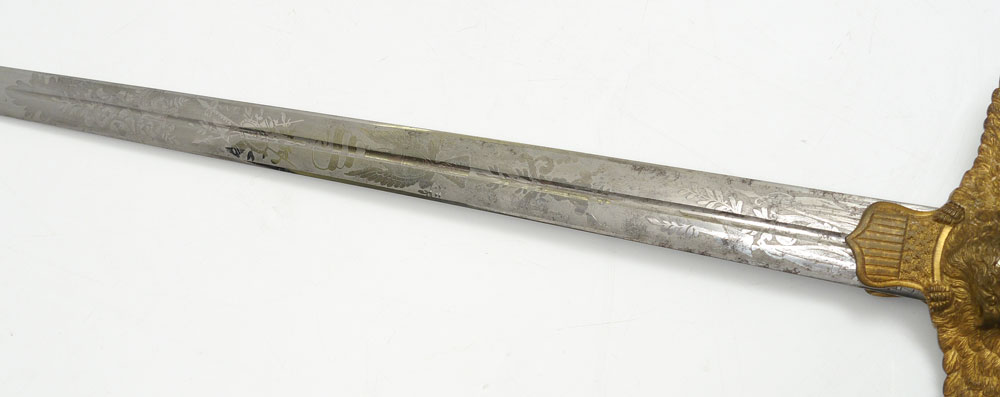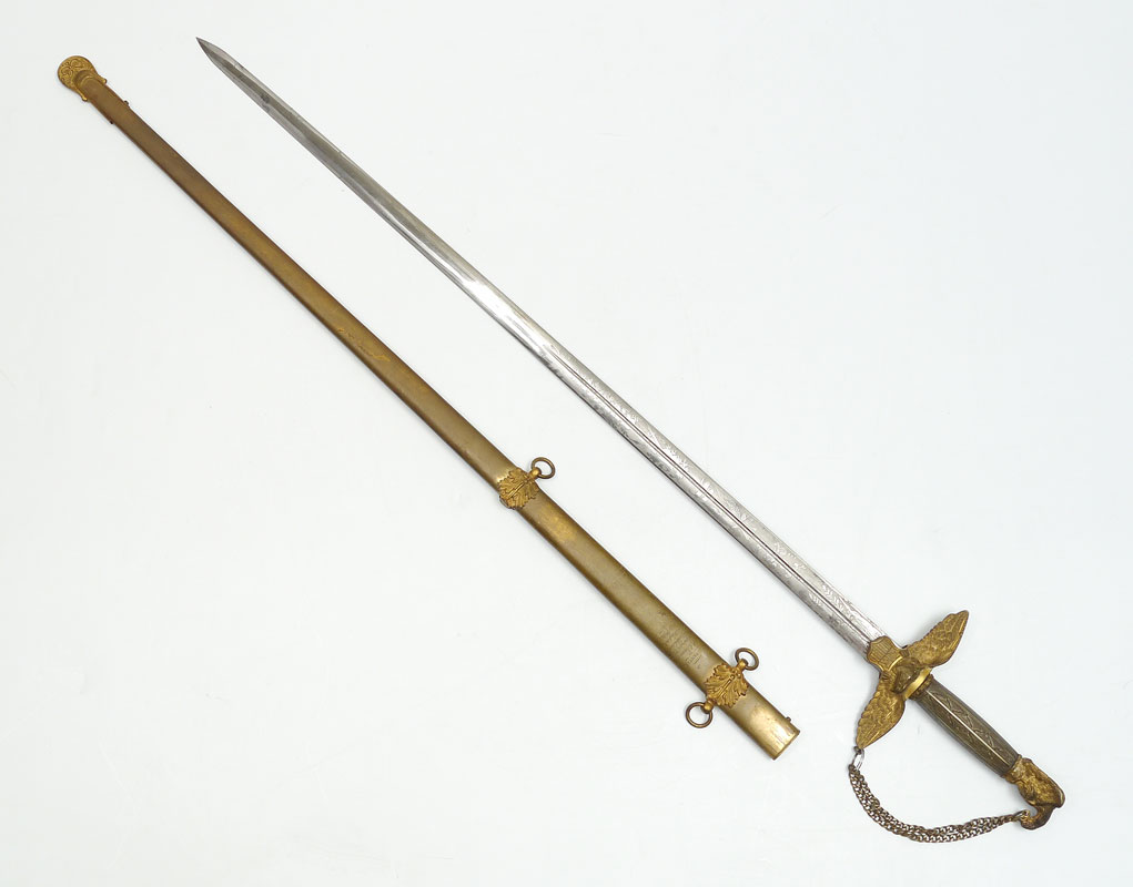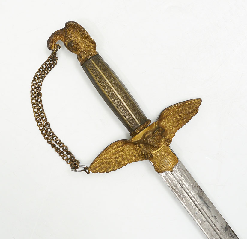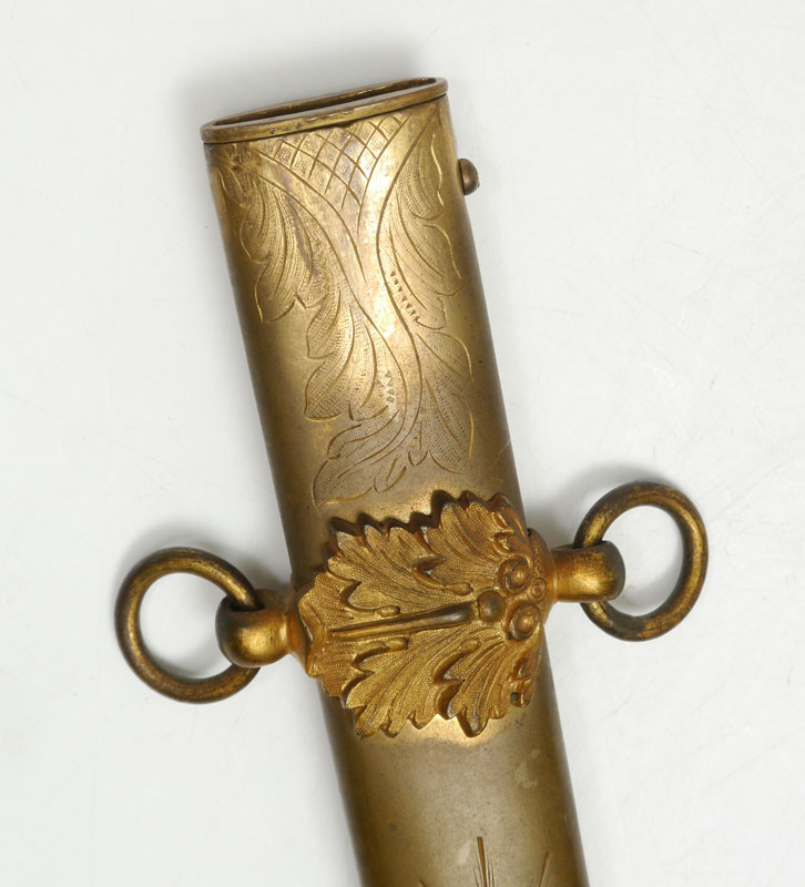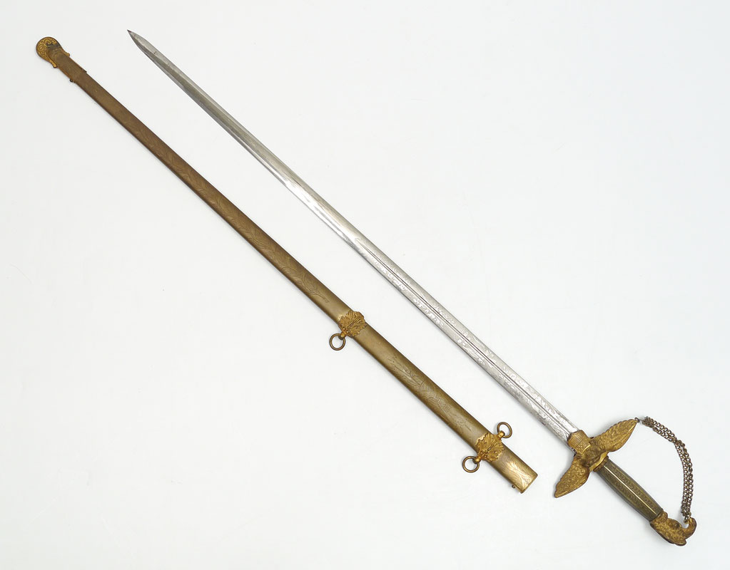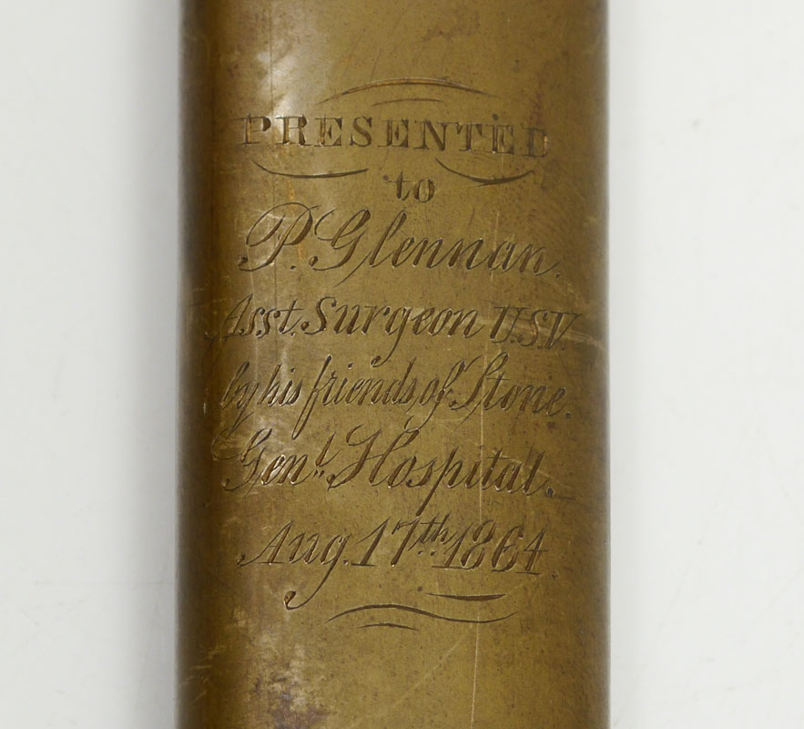 CIVIL WAR MEDICAL OFFICERS PRESENTATION SWORD: Militia staff officers with period and correct dedication on scabbard ''Presented to P. Glennan, Asst. Surgeon USV by his friends of Stone Gen'l Hospital, Aug. 17th, 1864''. Patrick Glennan was in charge of Stone General Hospital in Washington DC during the Civil War and commissioned to Assistant Surgeon US Volunteers on May 18th, 1864. His son James Glennan oversaw the construction at Walter Reed General Hospital as a Brigadier General in the 1920's. Militia sword grip with gilt bronze eagle finial, silver grip, spread eagle over shield cross guard. Unmarked 31'' frosted blade with foliate, stand of arms, US eagle and motto, and other military decoration. Engraved brass scabbard with traces of gilt remaining in protected areas, gilt mounts. Overall measures 38 3/4'' long.