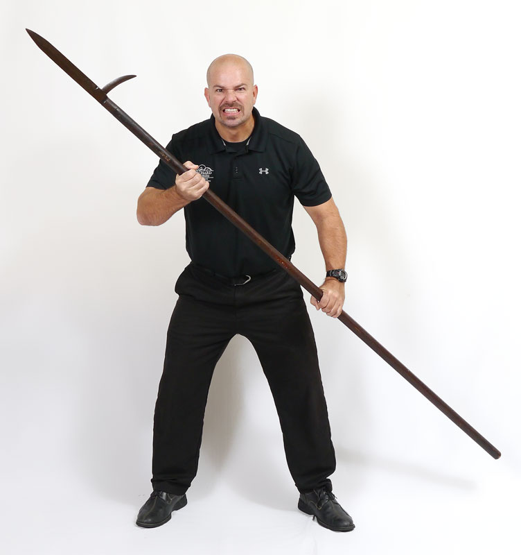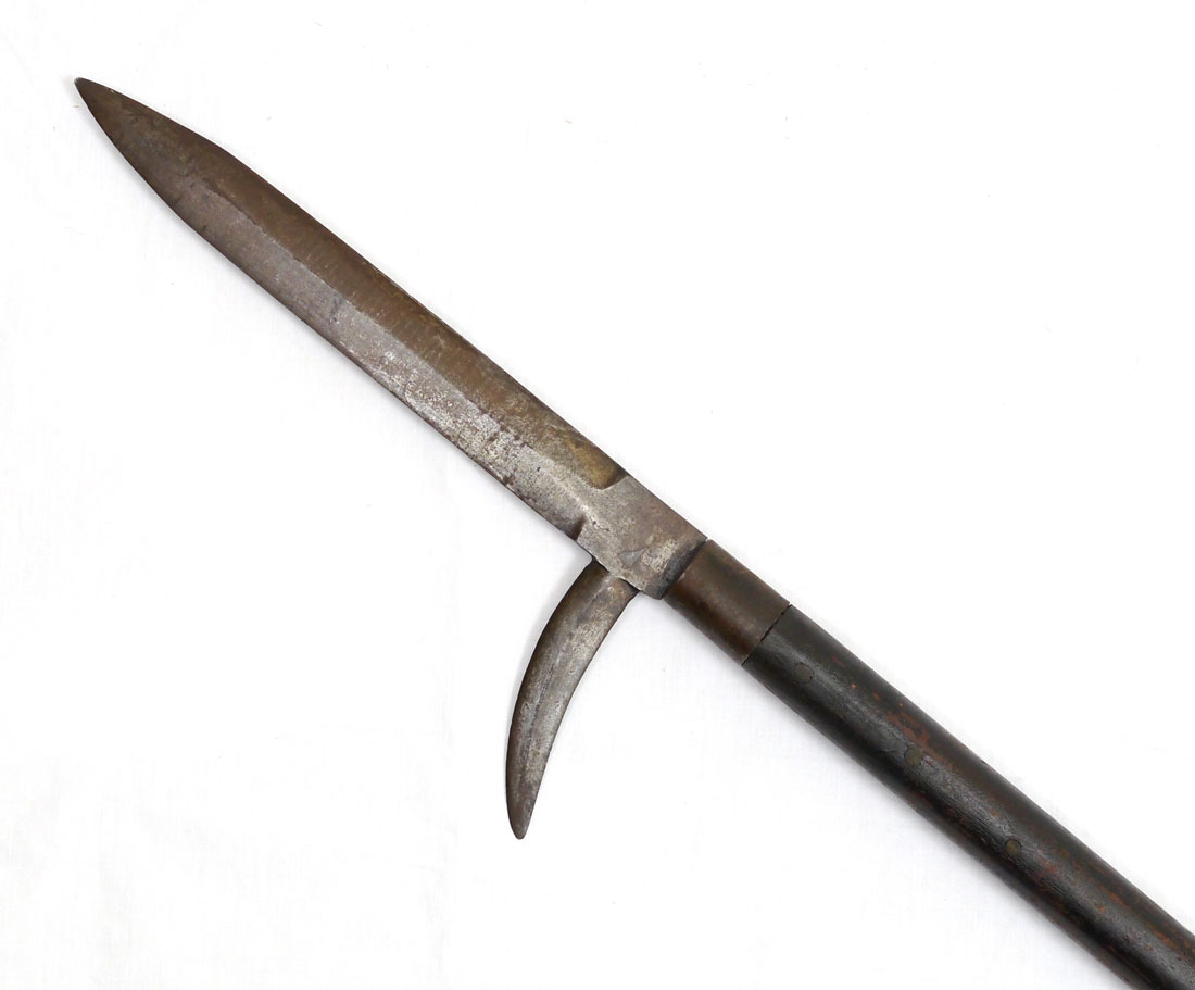 GEORGIA CONFEDERATE BRIDLE CUTTER PIKE: Civil War era, typical unmarked example, complete with original full length pole. 12 3/4'' long iron blade, 4 1/4'' hook, and collar, overall affixed to pole 93'' long.