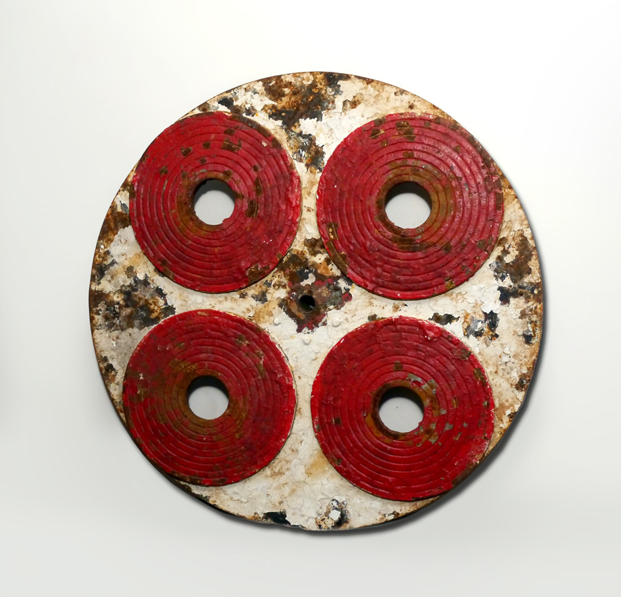 EARLY 20TH CENTURY CAST IRON SHOOTING GALLERY TARGET: Circa 1910-1920, unique circular target with 4 targets, original mounting hardware on back. Many of these we repainted over and over during the years, multiple layers of thick paint. Overall measures 30 1/4'' x 2''.
